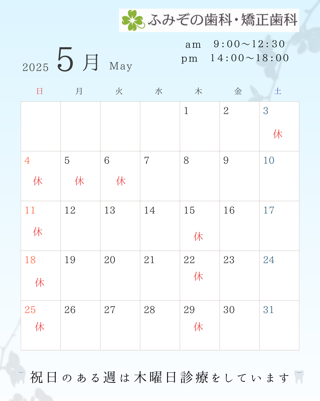 2025年5月休診のお知らせ🎏🌟GWは3日~6日まで休診となっております!8日(木)は診療日となっておりますのでよろしくお願いいたします☺✨5月もよろしくお願いいたします!♡