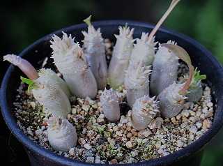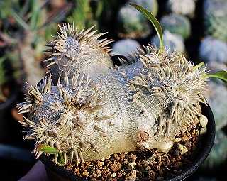 ガマンマのニク・サボ栽培にようこそ ^^ 1月11日(日)曇後晴、朝7~夜0℃ 湿度38 %、西風7(m/s)。12日は晴て-2~7℃に、 13日は風向きが変わり2~14℃に。 本日は、落葉したパキポデウム エビス笑い とグラキリスとエビス大黒等の様子です。 にほんブログ村 ![]() パキポデウム・エビス笑い (Pachypodium brevicaule) 国内実生の栽培苗、輸入された現地球 の栽培は癖があり難しいと言われるが、 国内実生苗は特に問題はない。 ![]() エビス大黒×エビス笑い 自家産実生、姿はほぼエビス笑い。 ![]() エビス笑いラメリー台木接ぎ 接ぎ木しても然程成長に差はない ![]() パキポ・エビス大黒 (Pachypodium Densicaule) デップリ塊根から太く短いトゲトゲ の茎が格好良い人気種。 エビス大黒 自家産実生 茎が無いのでエビス笑いかも知れない。 ![]() エビス大黒 昨年の自家産種子実生苗、秋に植え替えた 1鉢は半数腐った、春まで待てばよかった。 ![]() パキポ・グラキリス (P. rosulatum ssp. gracilius) ロスラツム亜種、双頭の国内実生苗。 パキポ・グラキリス×エビス大黒塊茎はグラキリスで茎や葉は大黒型 格好良い姿に成長しそう。 ご覧いただきありがとうございます よかったらポチをお願いします。 にほんブログ村 お気に入りの記事を「いいね!」で応援しよう