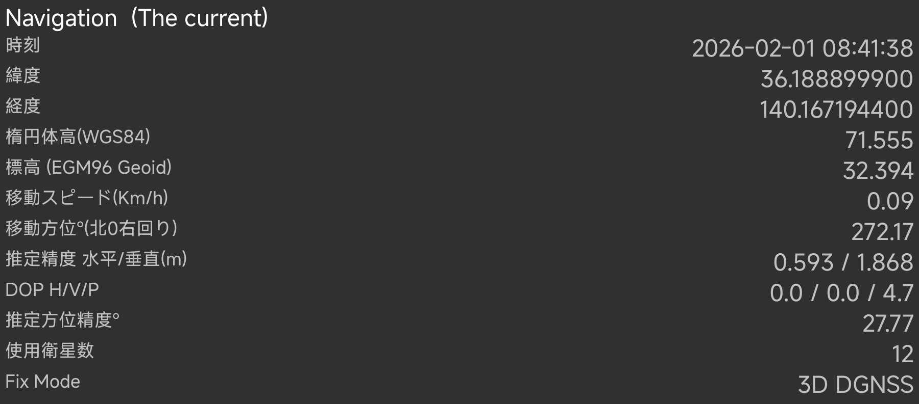 今回は、10HzのGNSS測位における、仰角とシグナルレベルのカットオフ値の設定検証です。 例によって朝6:30に家を出て筑波山方面へ。 Test1として、自宅からサンドイッチ屋のつじやまでの道中で、最低衛星仰角40度(デフォルトは15度)、最低シグナルレベルを35dBHz(デフォルトは15dBHz)に設定して、OBD2からの速度信号から算出したtripと比較を行います。 結果、55km程走行し、誤差150mということなので、市街地ではこの設定でも問題なさそうです。 で、つじやで朝食のサンドイッチを食べた後、林道に向かいます。 今回は主に山道/林道というGNSS測位が最も厳しい環境において、可能な限り精度を上げるには仰角とシグナルレベルのカットオフ値をどのように設定したら良いかを検証するため、基本的に走行するのは林道/山道のみ。 去年の第1戦で使用したルートを組み合わせて、下記のような周回コースを作成しました。 走行距離は1周14.9km程度です。 Start / Goalの他、A~Hの8つのジャンクションがあるので、そこでtripをチェックします。 ![]() コースの概要は下記のような感じです。 Start ~ A:周囲に田畑が広がる開けたエリア、センターラインなし、すれ違い可 A ~ B:林道に繋がるルート、民家あり、センターラインなし、すれ違い困難 B ~ C:林道、アップダウンあり、すれ違い困難 C ~ D:石岡つくば線、林道、アップダウンあり、すれ違い困難 D ~ E:林道終わり、表筑波スカイラインへの誘導路、短い E ~ F:表筑波スカイライン、アップダウン、センターラインあり、速度アップ F ~ G:フルーツライン、ダウンヒル、センターラインあり、キャッツアイ多い G ~ H:ダウンヒル終わり、県道138号への合流、短い H ~ Goal:県道138号から逸れてゴール 肝は、 ・B~Eまでの林道で如何にGNSSの精度を上げられるか と、 ・その設定でその他の区間の精度が高いか です。 まずはTest2として、ここまで来た時の設定である、 最低衛星仰角:40度 最低シグナルレベル:35dBHz のまま走ってみます。 スタート直前の状態はこんな感じ。 ![]() ![]() ![]() で、走った結果がコチラです。 OBD2からのtripと比較しています。 ![]() 距離はコマ図間ではなく、各地点での累積です。 全体的にOBD2と比較して距離が短い傾向があるのですが、累積なのでその差が徐々に蓄積されていきます。 最終的に15km弱走って370mの誤差が出ました。 続いて、Test3は、 最低衛星仰角:25度 最低シグナルレベル:35dBHz にします。 仰角だけ40度から25度に下げて許容範囲を大きくして、最低シグナルレベルは変更していません。 走行前の状態はコチラ。 ![]() 受け入れる衛星の仰角を広げたので、使用する衛星が先程の12機から18機に増えました。 ![]() ![]() ![]() 最低仰角40度の時よりも、25度にした方が各コマ図における累積距離がOBS2の距離に近づきました。 ただ、仰角40度が林道で悪いという訳ではなく、最終的に70mの差がついてますが、 ![]() ![]() こうやって見ると、林道区間では意外と健闘しています。 続いてTest4では、 最低衛星仰角:20度 最低シグナルレベル:40dBHz にしてみます。 横からの衛星も受け入れるけど、樹木の間を抜けてシグナルレベルが少しでも下がったら受け入れないよ、という、まさに「飴と鞭」な設定です。 最初にシグナルレベルのカットオフを50dBHzにしみてたところ、スタート地点でも捕捉できる衛星が0機になってしまったので、40dBHzに落としました。 ![]() 使用する衛星の数が一気に8機まで減りました。 高度に関する精度も落ちましたね。 ![]() ![]() 走行を開始したところ、すぐにGNSSをロストすることが頻発しました。 スタートからA地点までは開けているところですが、それでもシグナルレベルをカットオフ値以上に確保できる衛星が少なくなったのでしょう。 結果としてOBD2との誤差も一気に広がりました。 ![]() gpxファイルをチェックし見ると、ロストと復活を繰り返しているので、ジャンプしまくりです。 ![]() どうやら飴と鞭作戦は失敗に終わったようです。 じゃあってことで、次のTest5の設定は、 最低衛星仰角:40度 最低シグナルレベル:25dBHz です。 Test2の設定と同じ仰角で、受け入れるシグナルレベルを広げてあげた感じですね。 ![]() 使用衛星数は12機から14機に増えました。 ![]() ただし、Test2をやった時から2時間経過していて、Test2の時よりも全天に満遍なく衛星がある感じです。 やはり衛星も結構動いているので、直接比較はできません。 ![]() 結果としてはこんな感じです。 ![]() Test2と5を比較してみると、シグナルレベルのハードルが下がって使用衛星数は増えても、最終的には負けてしまっています。 ![]() クオリティの低いシグナルが増えても悪影響を与えるだけということですね。 赤がTest2、青がTest5ですが、 ![]() ![]() 仰角が同じだからか、なんとなくラインも同じような傾向を示していますね。 続いて最後のTest6です。 ここでは、 最低衛星仰角:15度 最低シグナルレベル:30dBHz Test4で「飴と鞭(20度、40dBHz)」な設定を行いましたが、Test6では、飴を更に増やし、かつ鞭は減ら