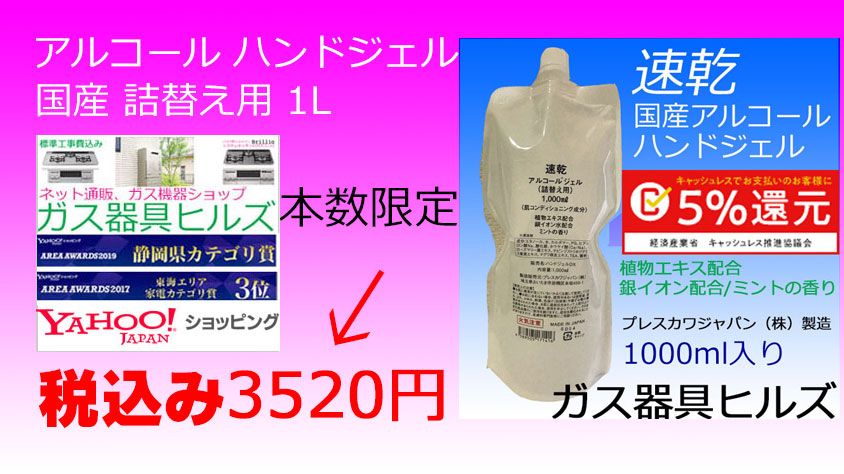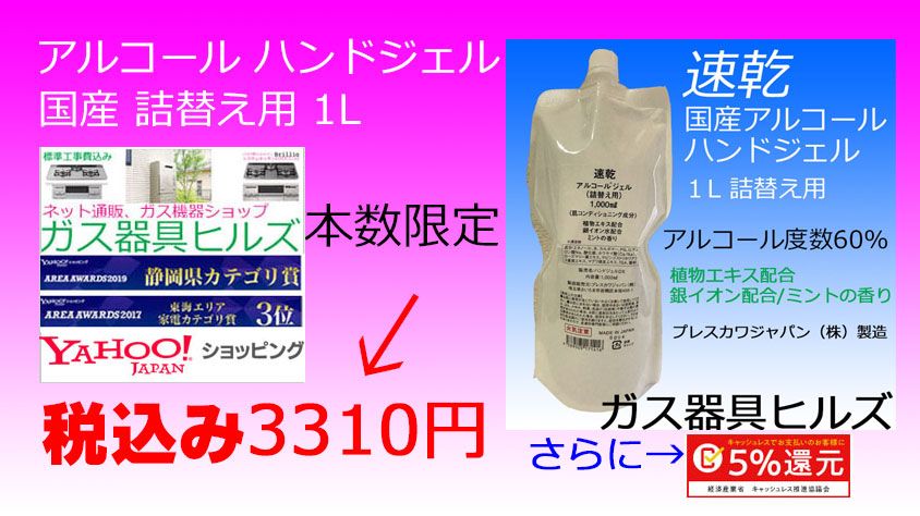 こんにちは、ガス機器/総合通販で、Yahoo!ショッピング所属のガス器具ヒルズ大阪営業所、くさがやです。いつもお世話になります。さて、月曜日から販売開始しました。アルコール ハンドジェルですが、残りあと、13本となりました。多くのお客様に、お役立て頂けたらと思っています。ご検討中のお客様は、お早めに、ご注文を入れてくださるようお願い申し上げます。アルコールジェルは、ここをクリック!https://store.shopping.yahoo.co.jp/gaskigu-hills/aruko-rujer1.htmlあと、現在、パロマビルトインガスコンロのセール中!今だけ、魚焼きグリル、ラ・クックグランや料理本など、総額1万780円分のプレゼントをもれなく実施中! 取付工事は、パロマの工事会社が全国施工このパロマPD-721WS-60CVは、ここをクリックhttps://store.shopping.yahoo.co.jp/gaskigu-hills/pd-721ws-60cv-torituke.htmlとにかく安い!ビルトインガスコンロをお探しの方!リンナイ ビルトインガスコンロ RS31M5H2SBW 都市ガス用が、この価格!このリンナイ ビルトインガスコンロ RS31M5H2SBWは、ここをクリック!https://store.shopping.yahoo.co.jp/gaskigu-hills/rs31m5h2sbw.html発行、草ヶ谷燃料株式会社 ガス器具ヒルズ 大阪営業所