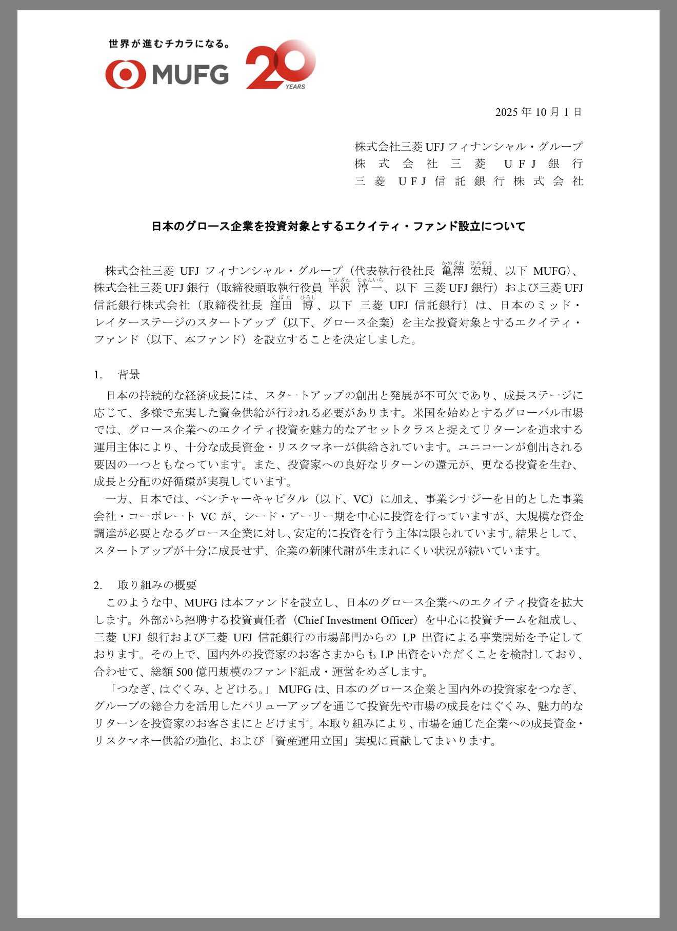 ![]() 2025 年10 月1 日 株式会社三菱UFJ フィナンシャル・グループ 株 式 会 社 三 菱 U F J 銀 行 三 菱 U F J 信 託 銀 行 株 式 会 社 🇯🇵日本の GROWTH企業を投資対象とする EQUITY・FUND設立に就いて 株式会社 三菱 UFJ FINANCIAL・GROUP 代表執行役社長 亀澤 宏規 かめざわひろのり MUFG) 株式会社三菱UFJ 銀行 取締役頭取執行役員 半沢淳一 はんざわじゅんいち 三菱 UFJ 銀行) 及び 三菱 UFJ信託銀行株式会社 取締役社長 窪田 博 くぼたひろし 三菱 UFJ 信託銀行)は、 日本のMID・LATER STAGEの STARTUP GROWTH企業)を 主な 投資対象とする EQUITY・FUND 以下、本FUND)を 設立するコトを 決定 仕舞したーー 1. 背景 日本の 持続的な経済成長には STARTUPの 創出と発展が 不🉑欠で在り 成長STAGEに応じて 多様で 充実した資金供給が 行われる必要が 🈶ります 米国を始めとする GLOBAL市場では GROWTH企業への EQUITY投資を 魅力的な ASSET CLASSと捉えて RETURNを追求する 運用主体に因り 十分な成長資金・ RISK MONEYが 供給されて居ます 🦄UNICORNが創出される ☝️要因の1つ⚡️ とも 成って居ます ◆又⚡️ 投資家への 良好な RETURNの還元が 更なる投資を生む 成長と分配の ♻️好循環が 実現して居ます🎉 ◆一方💢 ☔️日本では💦 VENTURE CAPITAL 以下、VC)に加え 事業SYNERGYを目的とした 事業会社 CORPORATE VC が SEED・EARLY期を中心に 投資を行って居ます ◆EQUITY・FUND設立に就いて 日本の GROWTH企業を 投資対象とし 大規模な 資金調達が必要と成る GROWTH企業に対し 安定的に 投資を行う主体は 限られて居ます💢 ◆結果として STARTUPが 十分に成長せず 🏢企業の新陳代謝が 🚼生まれ難い状況が 続いて居ます💢 ※🥸おじ🍞ぱんの ※くちゃくちゃ ※ぴちゃぴちゃ ※喰いのやうな ※云い訳ですネ 2. 取り組みの概要 此のやうな中 MUFG は 本FUNDを設立し 日本の GROWTH企業への EQUITY投資を 🆙拡大、仕舞す 外部から招聘する 投資・責任者 Chief Investment Officer を中心に 投資TEAMを組成し 三菱 UFJ 銀行 及び 三菱 UFJ 信託銀行の 市場部門からの LP 出資に因る 事業開始を予定して 居りますーー その上で 国内外の投資家の お客さまからも LP 出資を戴くコトを 検討して居り 🈴わせて 総額 500 億円・規模の FUND組成・運営を 目指、仕舞す ◆つなぎ、はぐくみ、とどける。 MUFG は 日本のグロース企業と 国内外の投資家を繋ぎ GROUPの 総合力を活用した VALUE🆙を通じて 投資先や 市場の成長を 🤱はぐくみ 魅力的なRETURNを 投資家のお客さまに 🕊️届けます ◆本取り組みに因り 市場を通じた 企業への成長資金・ RISK MONEY供給の強化 及び 資産運用立国」実現に 貢献して参ります ![]() 【本FUNDの概要】 ◆名称 Japan Growth Equity Fund (仮称) ◆形態 投資事業有限責任組合 ◆設立予定日: 2025年度中 FINAL CLOSEは 2026年度を予定) ◆FUND規模: 総額500億円・規模を想定 GP(無限責任組合員) 三菱UFJ 銀行が新設する子会社 LP(有限責任組合員) 国内外・投資家 三菱 UFJ 銀行 及び 三菱UFJ 信託銀行を含む) ◆主な対象企業: 日本のGROWTH企業 MID・LATER STAGEの STARTUP) 以 上⚡️ 🗞️黒星★ULTIMATE☆新聞【🔔Ⓜ️ARKET💥🔨】 お気に入りの記事を「いいね!」で応援しよう