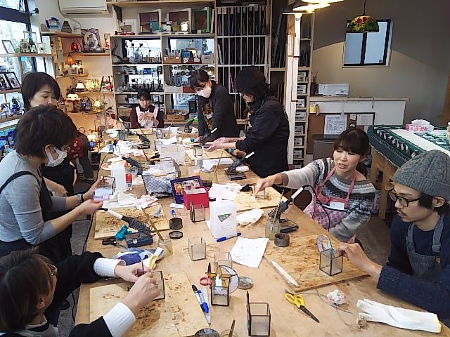 先日行われた体験講座 『駿河 東海道おんぱく in 静岡』・・・2/10 前編からの続きになります。 ![]() 楽しいお昼休み ![]() も、終わり、 午後は先程削り合わせたガラスにコパテープを巻く作業からになります。 ガラスとガラスははんだで接着することが出来ないので、コパテープ(銅のテープ、カッパーテープと呼ぶこともあります)をガラスピースの周囲に巻き付け、はんだで接着していきます。 ![]() 普段行われている体験講座のほとんどはここからの作業になっています。 テープの巻き方の注意点を聞き、作業を始めます。 テープがガラスの中心に貼られていると仕上がった時にキレイに見えるので、慎重に巻いて行きます。 ![]() みなさん、最初は慣れずに時間が掛かっていたテープ巻きも時間が経つにつれ、スムーズに巻けるようになりました。 そしてはんだ付け。 はんだの特性やはんだゴテの取扱い方を聞き、はんだをコパテープの上に流して行きます。 はんだを初めて使う方もいらっしゃいましたが、"みえ&ゆい"の二人の講師の指導の元、サクサクと作業が進みました。 ![]() そして自分で選んだデザイン(月と星、クリスタル、フローラル、ねこ、ハート)をBOXに取付け、完成になります。 最後はみなさん揃って、作品を手に記念撮影。 ![]() ![]() 自分で選んだデザイン、ガラスから作品を作ったということもあり、みなさんとても満足して頂いたようです。 参加されたみなさん、ありがとうございました🙇 自分もお手伝いしながら、みなさんのガラスの選び方や講師のトーク(脱線もしてましたが😜)など勉強になりました。 さて、この『おんぱく』のイベント、ガラス選びから始める体験講座はあと1回、3/4(月)にあります。 平日の開催ということもあり、若干お席が空いてるようです。 ガラス選び、カットから体験したいという方、是非チャレンジしてみて下さい。 満足頂けること、間違いありません👍 そしてオファーが入り、体験講座が続々と決まりました😊 3/22(金) " すろーかる "プレミアム・フライデーの体験講座(かわもと工房にて) 3/30(土)、31(日) ケイム技法ワークショップ(東京・神楽坂 がらすらんど本社にて) 4/7 (日) 日本茶カフェ san gurams 菊川店にて 4/29 (月・祝) SBS学苑(静岡校)にて 5月初旬 セノバ静岡にて を予定しています。 近日それぞれのお題を発表しますので、お楽しみに‼ ステンドグラス工房かわもとのホームページはこちら ステンドグラス工房かわもとのネットショップはこちら