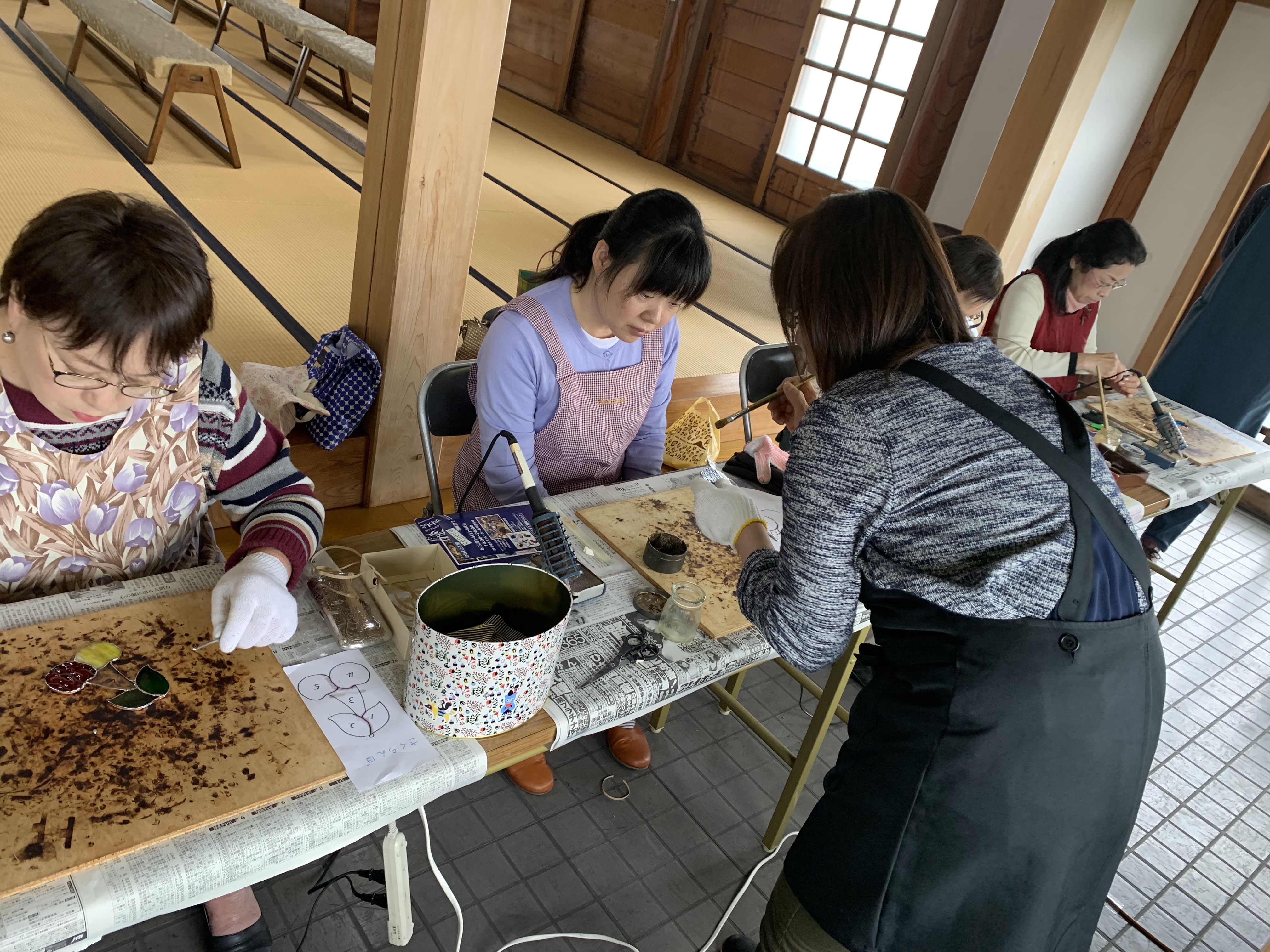 昨日、富士市浅間上町にある泰徳寺(たいとくじ)にて行われた ステンドグラスの体験講座に行って来ましたので、その模様をレポートします。 ![]() この泰徳寺では毎年文化祭が行われ、檀家さんが作った芸術作品を本堂に展示しています。 かわもと工房のインストラクター・山田尚美さんの作品も毎年展示され、今回の体験講座の依頼を頂いたそうです。 講師の山田さんにお願いして、体験講座の様子を写真に撮らせていただきました✌️ 昨日は第1班の講座(全4班)で6名の方にオーナメントの制作を体験して頂きました。 今回のお題はこちら、 ![]() みなさんステンドグラスのオーナメントを作ることが初めてということもあり、緊張しているように見えます。 ガラスは光を通して見るとキレイに見えるのですが、生憎外は曇り空☁️ 各々好みのガラスを選んで頂きました。 ガラスとガラスではハンダが付着しないので、ガラスピースの周りに銅のテープ(コパテープ)を巻き、ハンダを流して接着させます。 山田さんのレクチャーで作業を進めて行きました。 テープ巻きの作業 テープの真ん中にガラスがあるとハンダラインがキレイになります。 みなさん、苦戦してます。 ![]() 次にハンダ付けの作業 ハンダゴテを持つのが初めての方ばかり。 恐る恐るハンダを流して行きますが、慣れてくるとスイスイ。 ![]() 約60分程で可愛いオーナメントが完成しました。 先日フランスのノートルダム寺院の火災で尖塔が焼け落ちてしまいましたが、有名なステンドグラス(バラ窓)は奇跡的に無事でした。 割れなければ色褪せる事なく、ずっと同じ色を提供してくれるガラス。 光の良く入る場所に飾って、大切にしてくださいね。 体験して頂いたみなさん、ありがとうございました。 最後は講師の山田さんと完成した作品を持って記念撮影😊 ![]() 泰徳寺での文化祭は 5/19(日) 10:00〜14:00に行われます。 ![]() お時間がある方は是非、足をお運びください。 かわもと工房・インストラクターの山田さんの作品も展示されますよ。 また“かわもと工房”では工房にて、体験講座を受け付けています。 2名様以上と制約はありますが、どしどしお問い合わせ下さい。 📞054-264-3934 ステンドグラス工房かわもとのホームページはこちら ステンドグラス工房かわもとのネットショップはこちら お気に入りの記事を「いいね!」で応援しよう