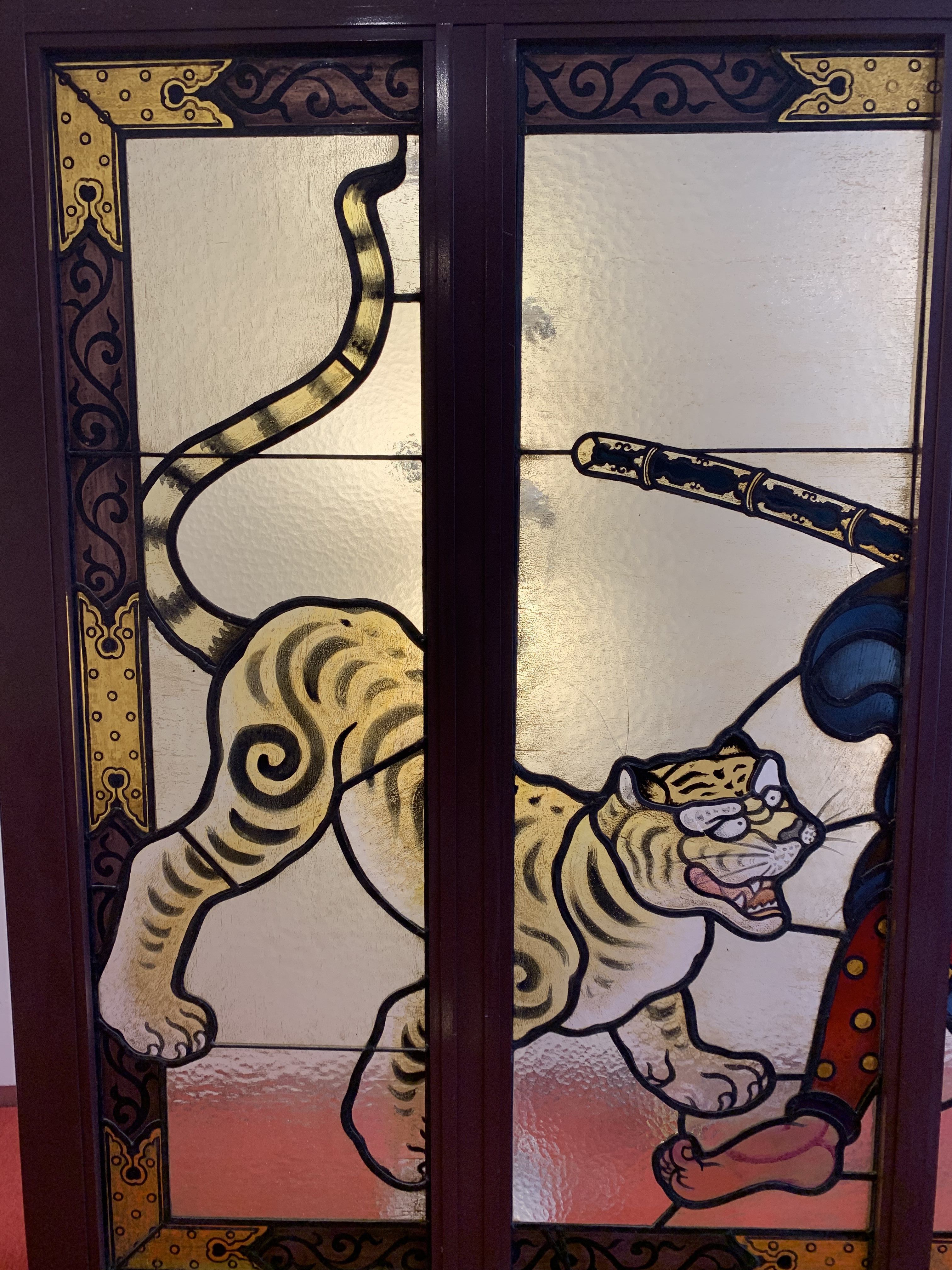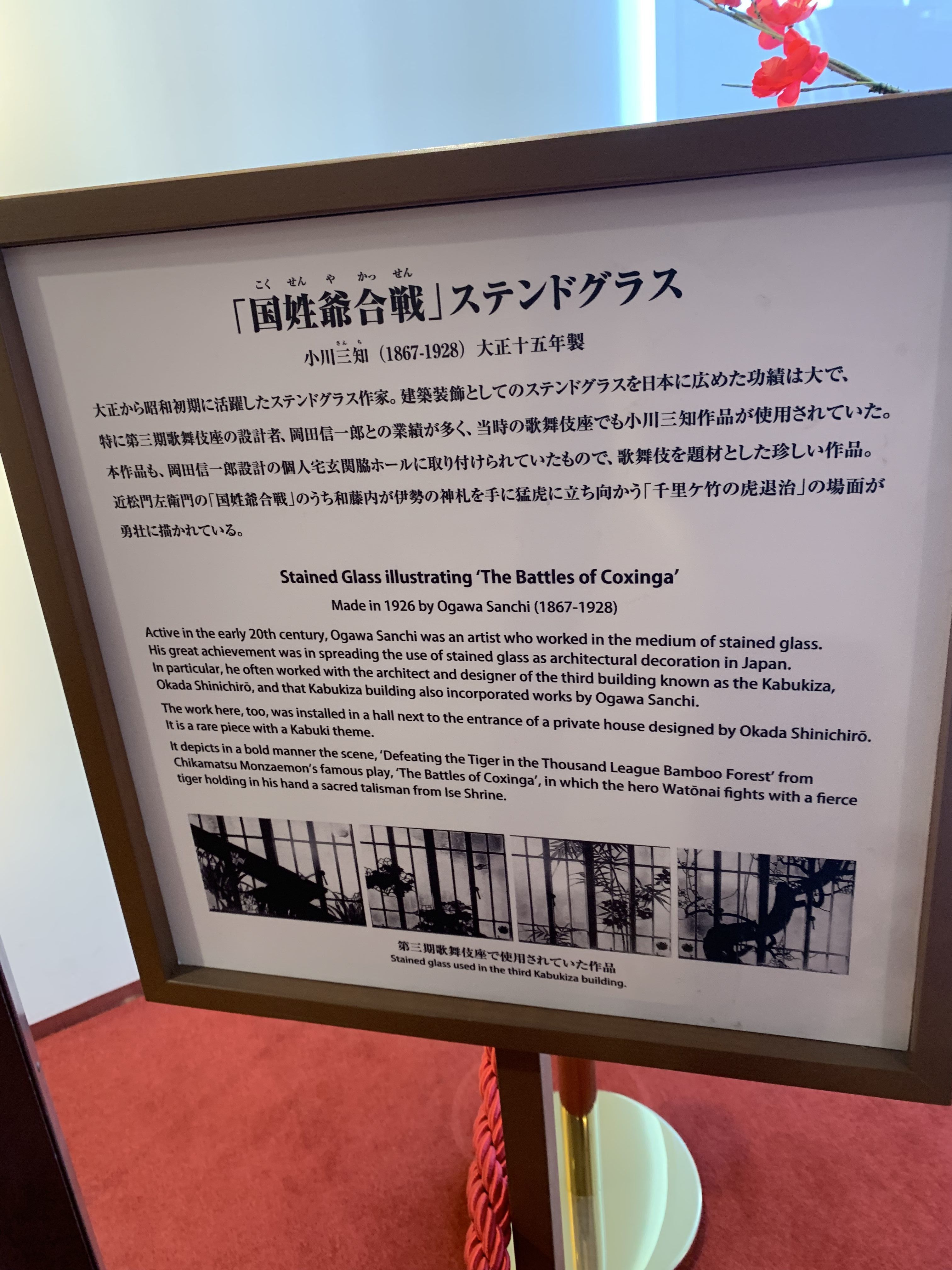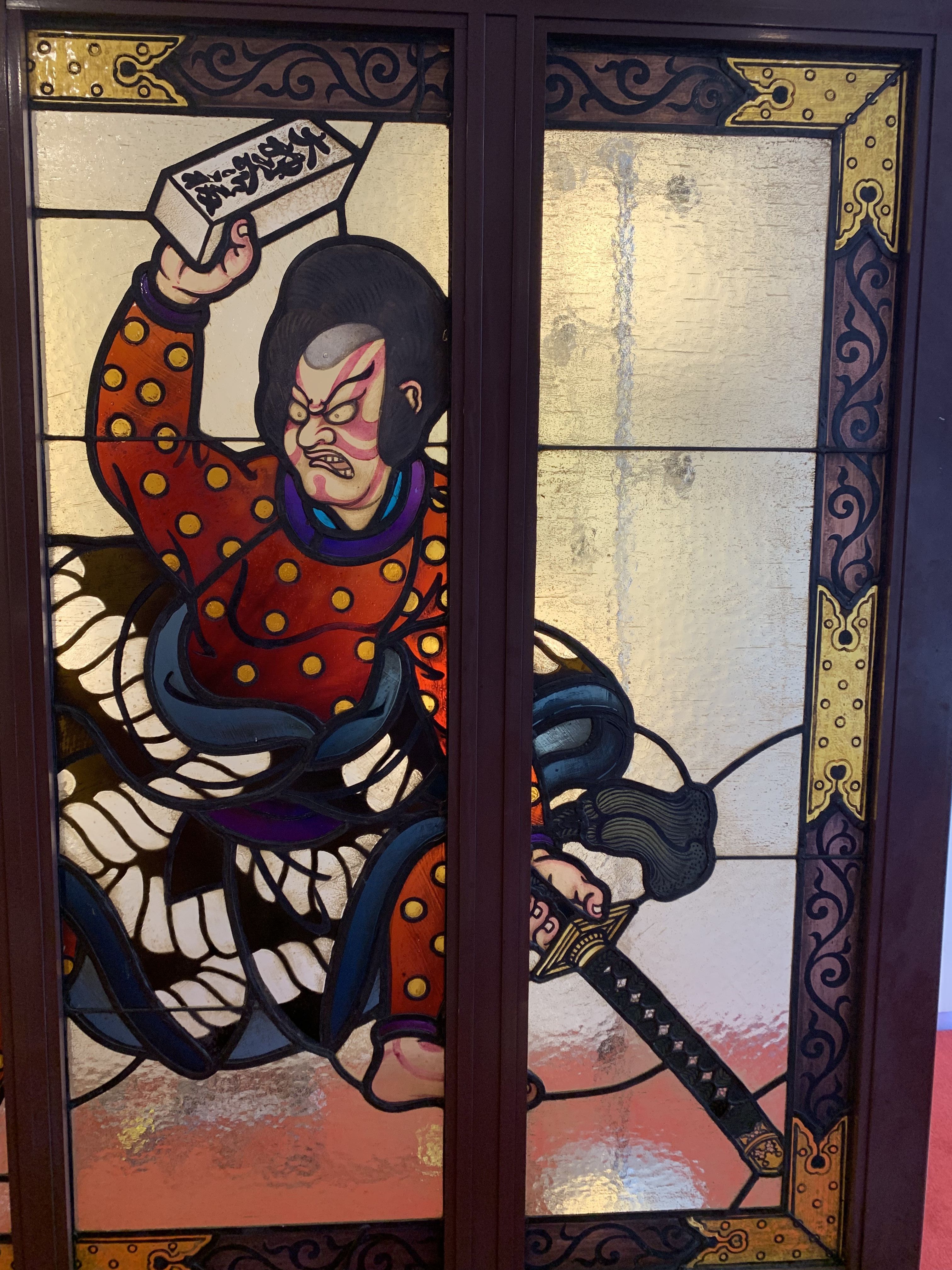 スマホ(2代目スマホ)を変更したため、以前の写真を未だに移動させられずにいます😢 前回の川越・旧山崎家別邸の後編が滞っています。 もう暫くお待ち下さい🙇♂️ 先に東京の『歌舞伎座』にあるステンドグラスを紹介します。 以前歌舞伎座を訪れた時に写真は撮っていたのですが、スマホが壊れてしまった(初代スマホ)ため再訪しました。 【平成最後】はこの作品で... ![]() 歌舞伎座が2013年4月に建て替えられ、6年が経ちました。 4階のエレベーター前に設置されています(4階へは無料で入場可能です😄) このステンドグラスは、“ 小川三知 ”によって制作されました。 小川三知はこのブログで何回も取り上げてきましたが、日本各地に作品が残っています。 この作品も個人宅にあったものを歌舞伎が題材となっていたため、歌舞伎座に移設されました。 近松門左衛門の国姓爺合戦の一場面、『千里ヶ竹の虎退治』が描かれています。 ![]() ![]() ![]() ![]() ![]() 三知の作品には珍しく、作品のほとんどが絵付されています。 特にボーダー(人間と虎の周りに使われているガラス)は如何にも“ 和 ”のテイスト、箪笥に使われている縁金具のようです。 いつもボーダーの絵付に悩まされているので、和の題材の時には参考にさせて貰います😅 銀座・歌舞伎座にお立ち寄り際には是非、ご覧下さい。 また以前ブログでお伝えした、我がかわもと工房で修復された三知のステンドグラス。 北海道小樽市・和光荘館長所蔵のステンドグラス。 ![]() こちらは館長の野口さんのご好意により、9月の“ かわもと作品展 ”にて再度展示されることが決まりました。 前回の静岡市役所でのお披露目会でご覧いただけなかった方は、是非足をお運びください。 詳しくはブログ又は、かわもと工房のHPでお知らせします。 いよいよ元号が【平成→令和】に変わります。 これからも“ かわもと工房 ”のブログをよろしくお願いします🙇♂️ ステンドグラス工房かわもとのホームページはこちら ステンドグラス工房かわもとのネットショップはこちら