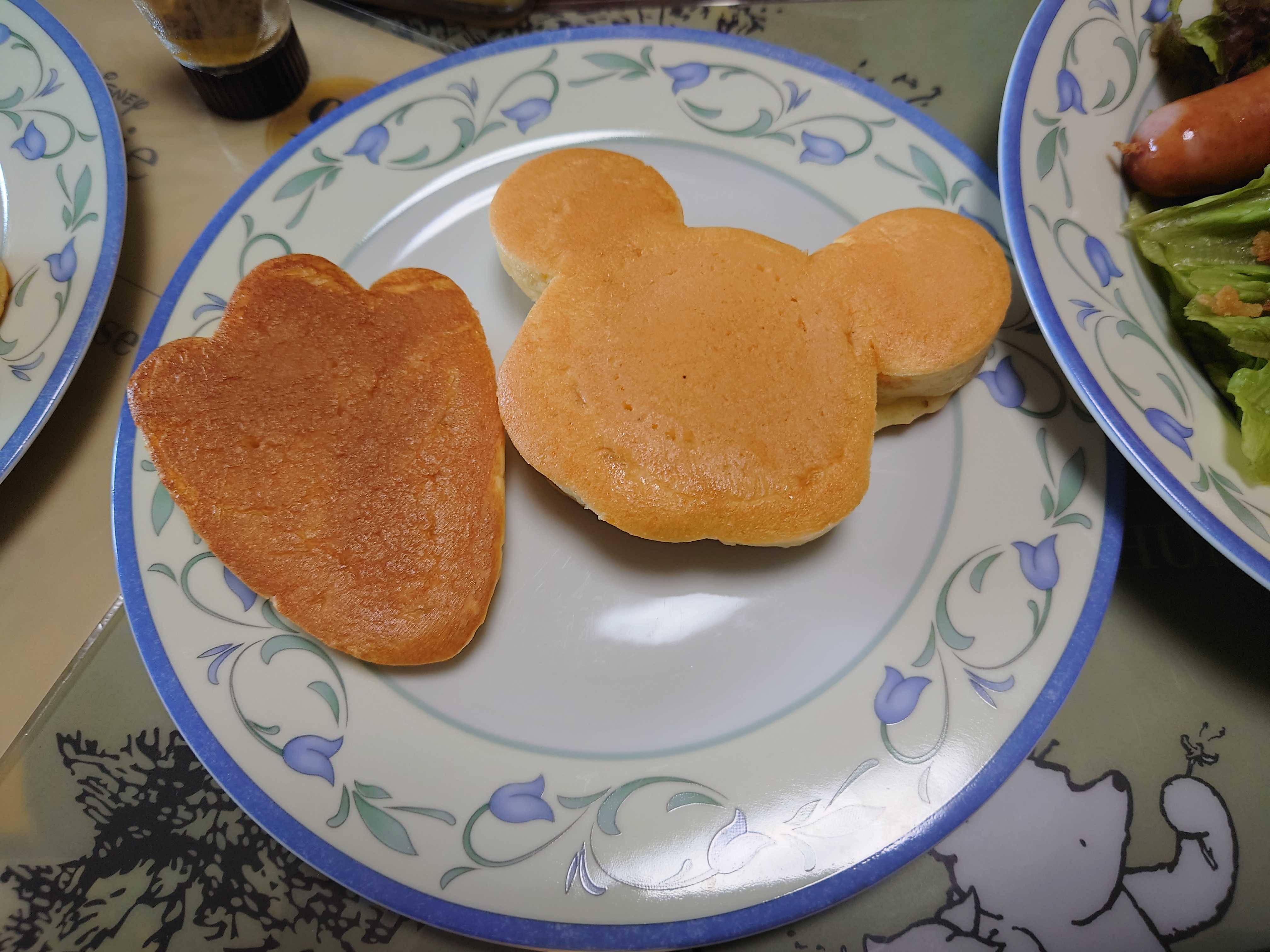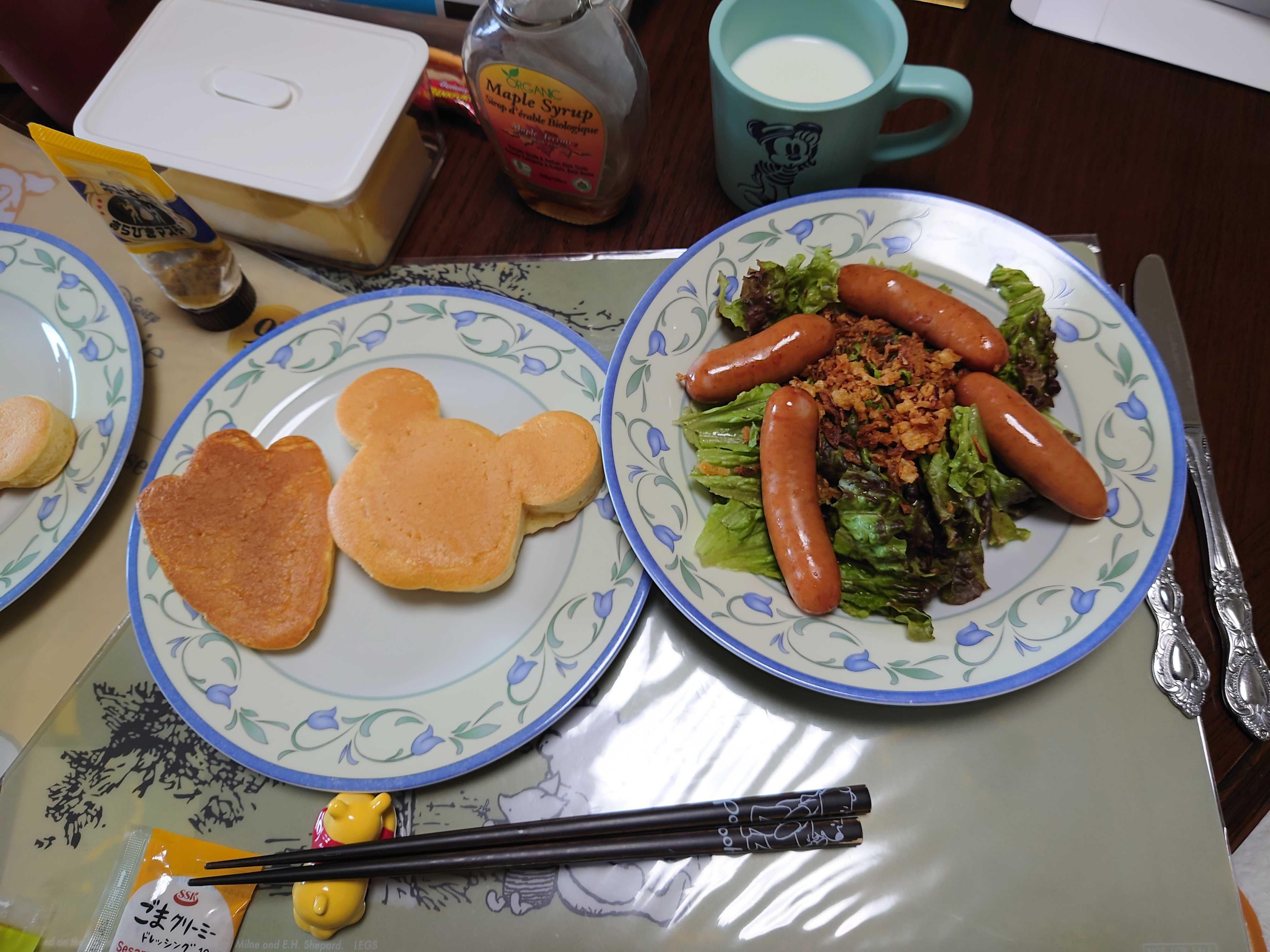 今朝の我が家の朝食は、ソーセージとホットケーキ。