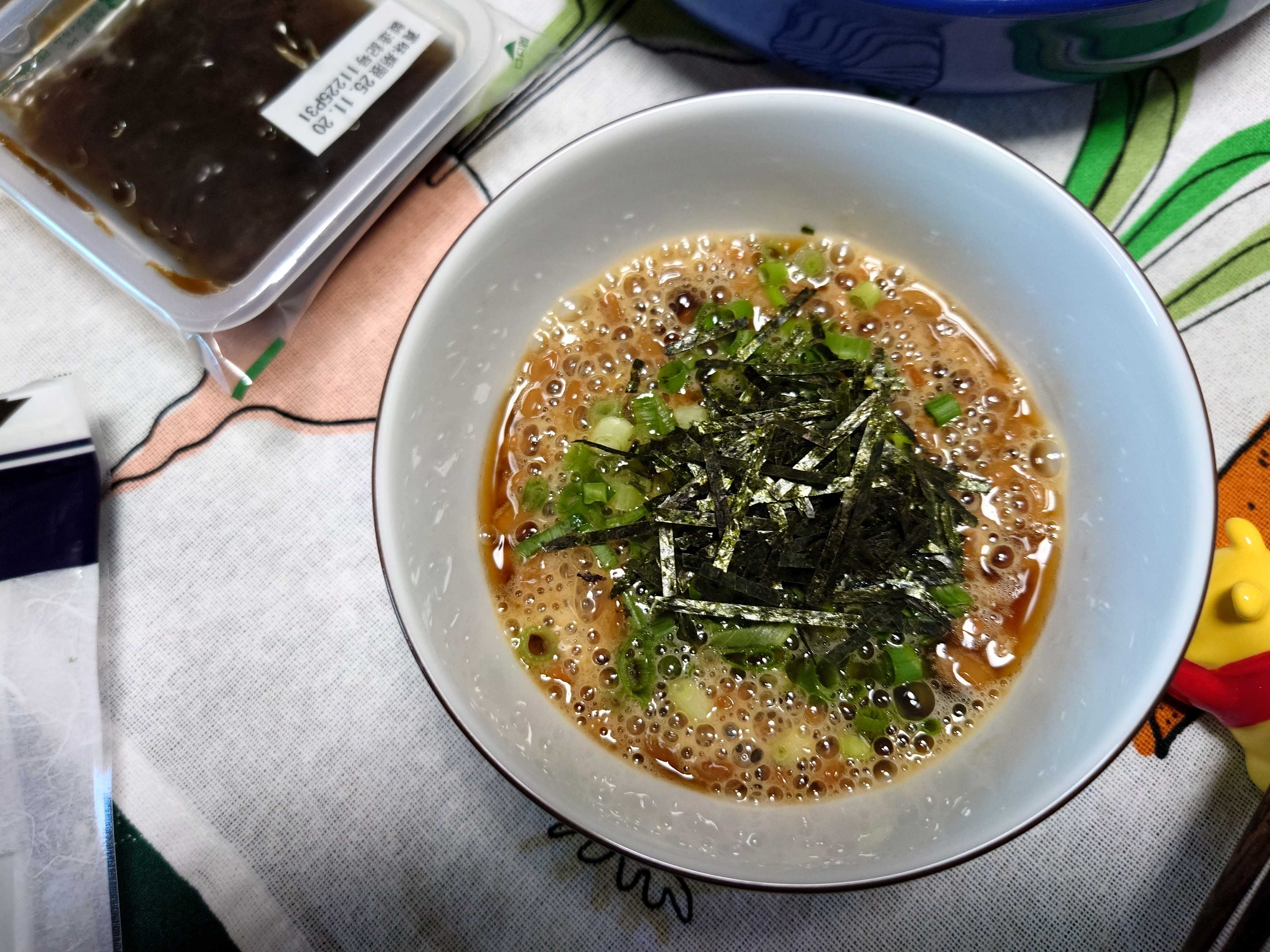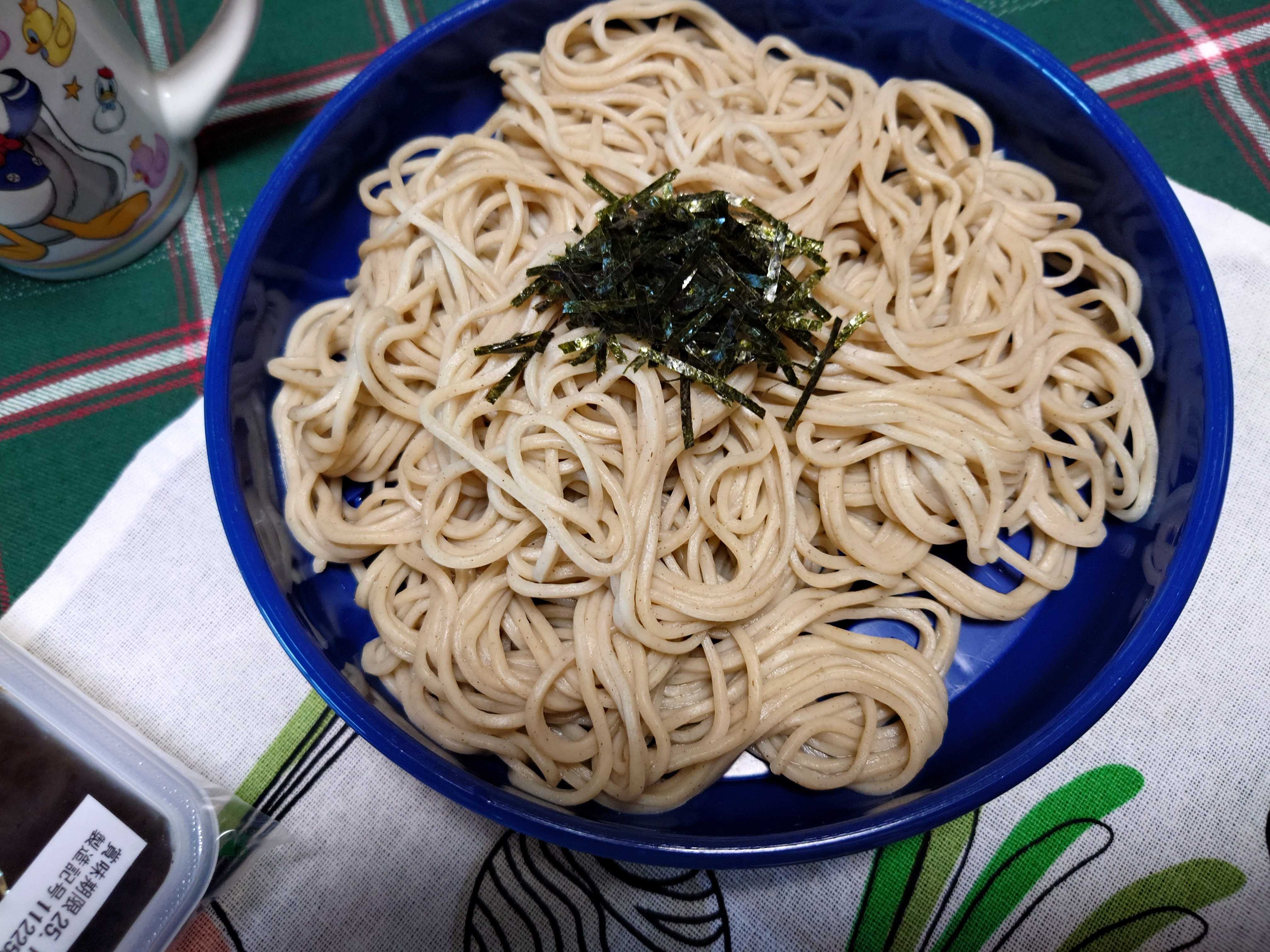 今朝の我が家の朝食は、「納豆もずくそば」。 ![]() 流水麺のそば。 ![]() つけ汁。納豆、もずく、ネギ入り。 ![]() デザートの八朔。