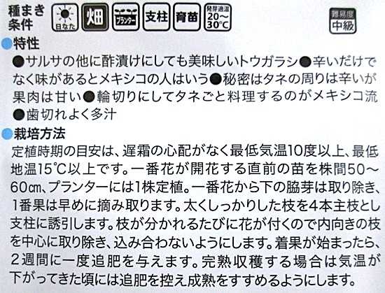 「ハラペーニョ」というとやはり思い浮かぶのは「辛い」という言葉でしょうか。 この「サルサ・デ・ウマイ」を育てる方も「辛さ」をご承知の上だと思いますが、では一体どのくらいの辛さなんでしょうか トキタ種苗(株)さんの「種苗と園芸2026」というカタログを見たところ、面白い記事がありました。 なんと、トキタ種苗の社員さんが青果を実食して実感した辛さを判定してくれました。うわぁ・・大変でしたね・・ 辛さのランクを1(ほとんど辛くない)~5(舌が焼ける)の5段階に分けたとき、「サルサ・デ・ウマイ」は真ん中の3(乾燥した鷹の爪くらいの辛さ)と書いてありました。 他にも特徴として「辛いだけなく味がある」「タネの周りが辛く果肉は甘い」「輪切りにしてタネごと調理するのがメキシコ流」と書いてありました ただ辛いだけではなく「ハラペーニョの味」を楽しめるのが「サルサ・デ・ウマイ」の魅力のひとつではないでしょうか。 しかもトウガラシの中でも辛さは真ん中ぐらい。 トウガラシを育ててみたいけど、あまり辛すぎるのも心配・・という方にも、これくらいなら丁度いい辛さかも? それにいろいろな料理に使えるのもいいですよね そういえば、以前私もハラペーニョを生でパリッとかじったことがあるんですが、汗が噴き出るほどの辛さでした トウガラシの青果を実食した、トキタ種苗の社員さんの仕事への熱意を感じます ↓こちらは当店トップページです。 家庭菜園用、直売店用、伝統野菜、プロ農家向き、新品種など、 他にもたくさんの種を取り揃えております。 お気に入りの記事を「いいね!」で応援しよう