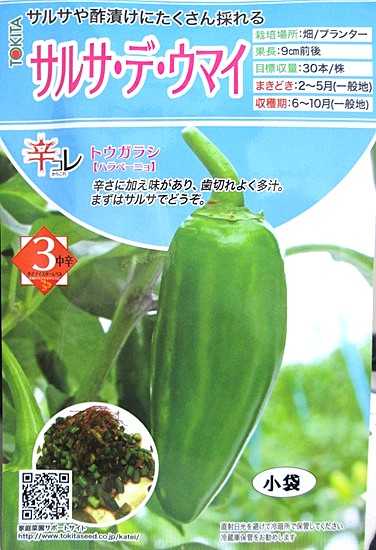 トウガラシ(ハラペーニョ)「サルサ・デ・ウマイ」です。 名前の通りサルサはもちろん、酢漬けやパスタ、カレーなどたくさんの料理に使えます。 比較的に育てるのが簡単ですので、ご家庭に数本あると気軽にメキシコ料理が味わえるかも? ![]() ![]() ![]() ~~~当店でもお取り扱いがございます~~~