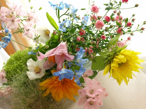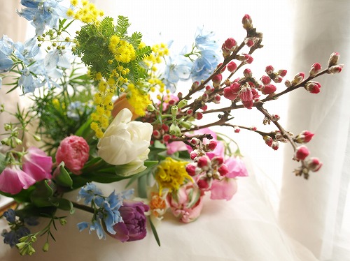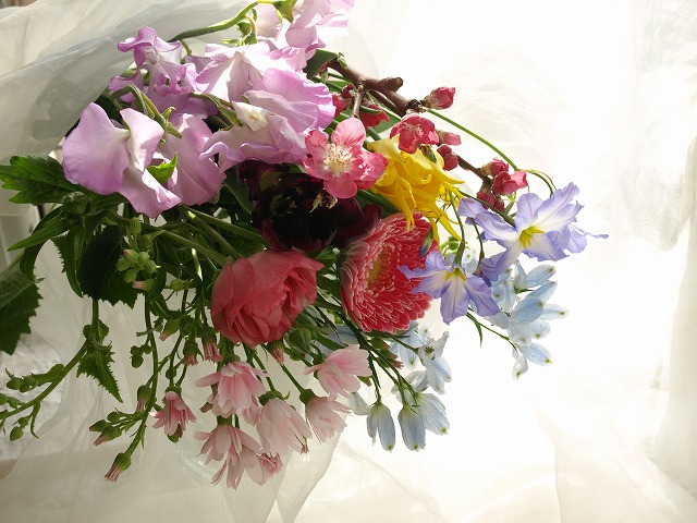 今月のお届けの花。枝もののレボリューションG・ガーベラ(アナクレート)チューリップ(ホワイトリバースター)(オレンジプリンセス)カラー(フローレックスゴールド)・ブルーレースフラワーなど。この枝ものが紅葉しているのか?普通にこういう色なのか?よくわかりませんー枝ぶりのしなやかさも明るい黄色もとってもいい感じ。実はちょっと前から市場には出回っていて・・・・教室で1度は活けてもらおう!と考えていたので今回仕入れできて大満足です。ぜひ明日の生徒さん、素敵に活けてくださいね~話は全然違うのですが市場の中のとある仲卸しさん。レジの横に「ウーパールーパー」を飼っています。いつも行くたびに気になって凝視しておりました。で、今日見てみたら「急に大きくなった気がするーー!!」軽く驚いたのでレジの横にいたスタッフさんに「普段どうやってるんですか?」と聞いてみた。「ときどき餌をあげるくらい」と手であげてるジェスチャーをしながら教えてくれました。私、しつこく「水はどれくらいで替えるんですか?」と聞くと別のスタッフさんに「どれくらい替えてるっけー?」「月・水・金」おー、かなり頻繁に水替えをしてもらってるのか。だから我が家の亀のように水が真緑にならずにきれいなのかー。ウーパールーパーの飼い方をしつこく聞くおばさん、面倒くさかっただろうな。ごめんなさい。。。教えてくれてありがとう~おまけ。キッチンから見える景色。只今紅葉真っ盛り。もみじがないから真っ赤はないけど(少しはあるけど)黄色とオレンジがきれいです。