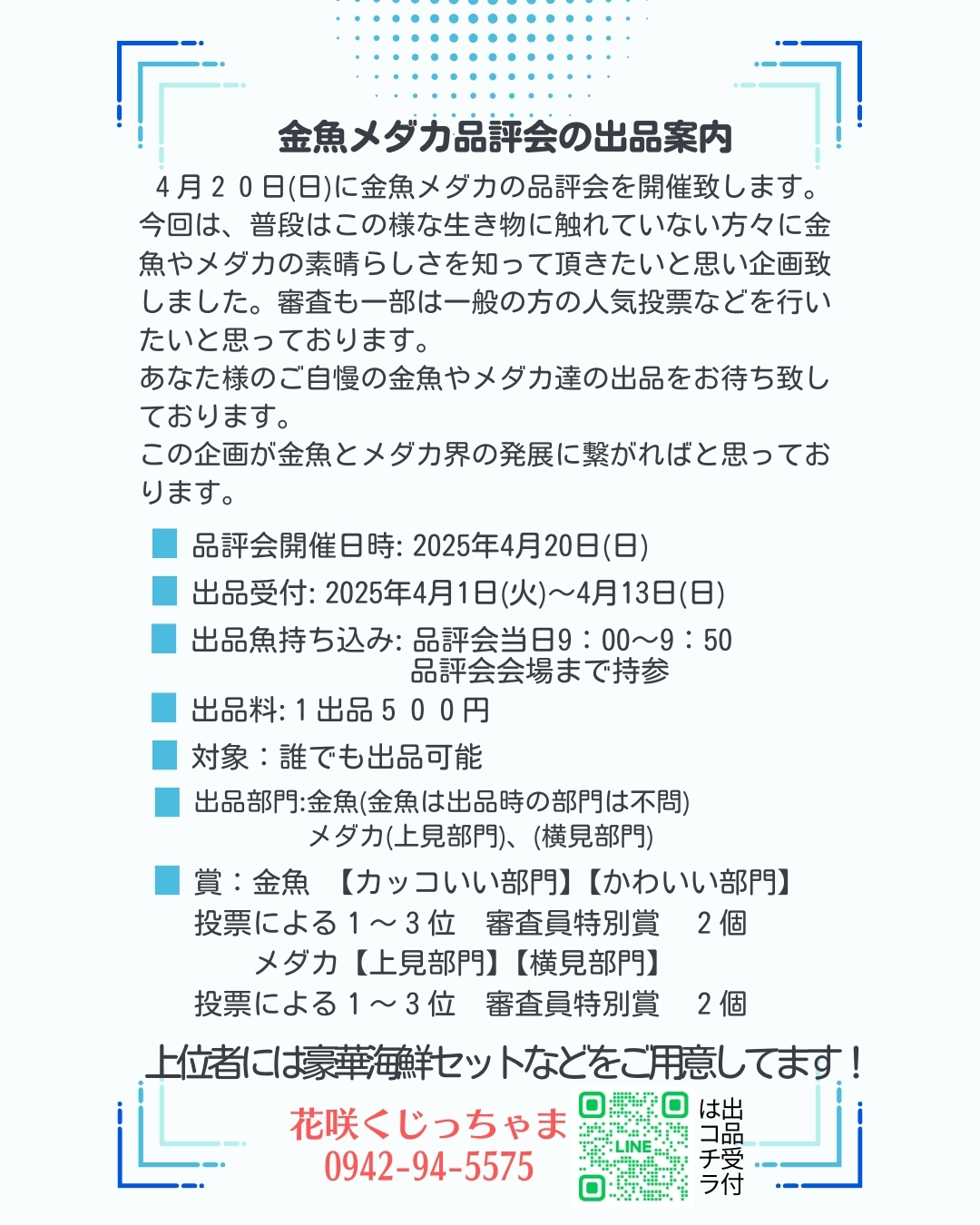 皆さんこんにちは! 日中の気温も上がってきて、魚達も餌を欲しがって元気よく泳ぎだしてきました。 朝の気温が上がってくるとまだまだ調子も上がってくると思います。 さて、4月20日(日)に金魚メダカ品評会、競りが開催します! その品評会での出品をご紹介します!(^^)! ![]() ![]() 皆様のご出品をお待ち致しております(^^♪ 【入荷情報】 ピンポンパール ![]() 白黒オランダST ![]() 銀鱗玉サバ(吉野産) ![]() キャリコフナ尾和金(荻野産) ![]() 更紗和金(平賀産) ![]() 更紗琉金(平賀産) ![]() 出目金(平賀産) ![]() らんちゅう貴族 土佐姫 ![]() 各サイズ入荷! 冷凍赤虫 青仔用赤虫 コペポーダ その他、色々と入荷しております! 土日特価品もご用意して皆様のご来店を心よりお待ち致しております。 ホームページはこちらから オンラインショップはこちらから 当ブログは日本ブログ村に登録致しております。 下の画像を押して頂ければランキングに反映されますのでご協力をお願い致します。 にほんブログ村 株式会社西日本観賞魚 佐賀県金魚メダカ小鳥小動物爬虫類販売店 花咲くじっちゃま お気に入りの記事を「いいね!」で応援しよう