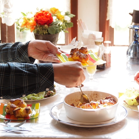 今年も始まりました 朝ごはんフェスティバル2012モンテローザも最近大人気のベイクドフレンチトーストで【パン部門】に参戦していますその人気メニューはこれですこのメニュー 実を言うと「もったいない」から生まれたエコレシピなんですディナーのチーズフォンデュはパンもチーズもおかわりしていただけるよう多めに用意しているので パンは毎回残りますアイルランド人の常連のお客様から 余ったら翌日フレンチトーストにするといいですよ と教えてもらって作り始めました最初はフライパンで焼いていたのですが お客様のお食事の時間に合わせて上手に焼くのは難しい!そこで キャセロールに移してオーヴンで焼いみたところ これがとっても美味しかったんです夕食の片付けが終わった後 卵と牛乳とお砂糖でカスタード液を作り冷蔵庫で一晩じっくりバケットに吸わせますそれぞれのお客様のご希望の朝食時間に合わせオーヴンに入れてタイマーを合わせて焼くだけ。シナモンとメープルシロップは別添えにしてありますのでお好みでたっぷりかけて召し上がってください節約 簡単 超美味しい! と3拍子揃っちゃいました この3連休に連泊された2組のお客様は2日目の朝もベイクドフレンチトーストをリクエストされました最近は残ったパンだけでは足りないのでベイクドフレンチトースト用にた~っぷりバケットを用意するようにしています今回楽天トラベル朝ごはんフェスティバルは人気投票なので【美味しそう!】と思って下さったら是非是非1票モンテに投票してくださいねTwitter ・ Facebook での拡散も大歓迎!投票はこちらから無料宿泊券プレゼントに応募していただくこと=投票になりますので下記バナークリックしてジャンプしたページののボタンをクリックしてお進みください↓超一流のホテルのシェフと同じ土俵で戦わせていただけるなんて少々おこがましいと思いつつとっても幸せ!モンテの母さんに応援よろしくお願いします