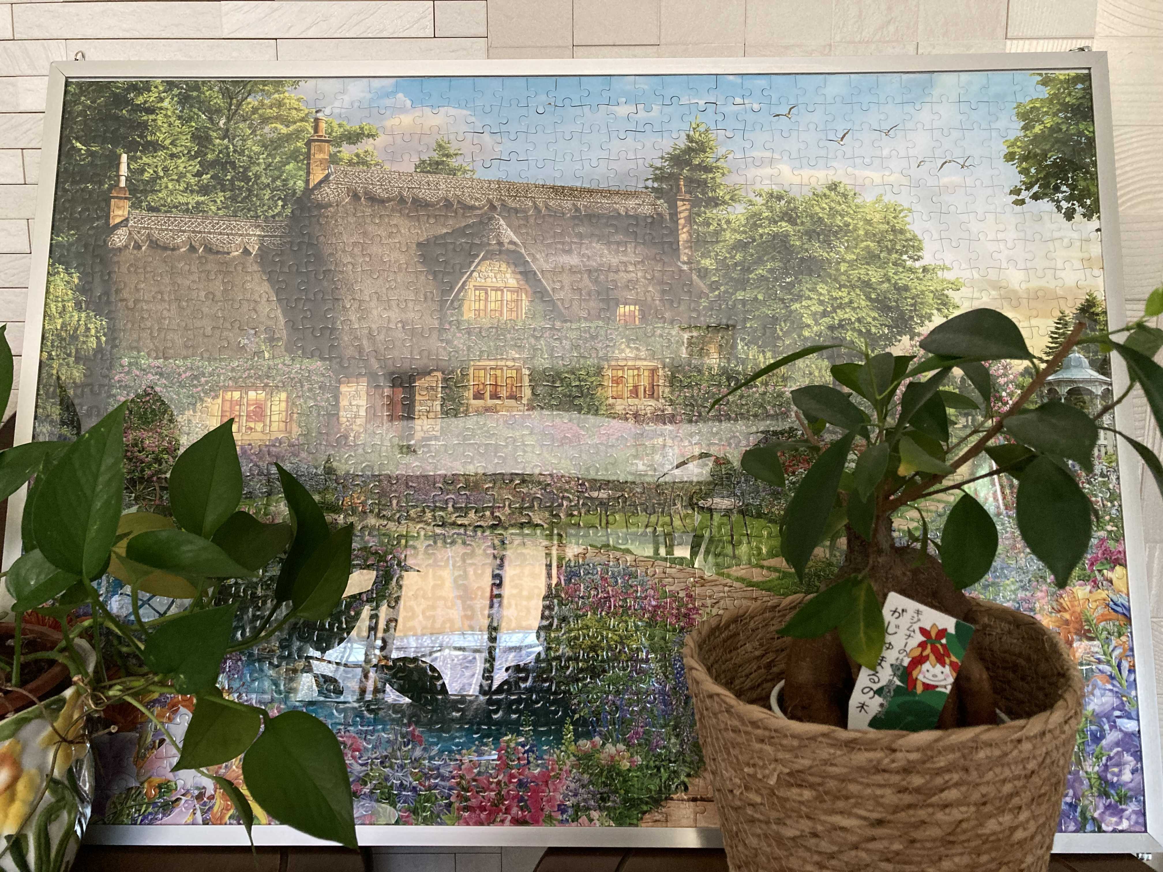 何とか絵の手がかりで半分。 終わる気がしない~ 約1週間で完成。 私頑張った!偉い!(誰も褒めないから自分でねぎらおう) 額は合わないので、端を詰めて何とか納めた。 足りないピースもあったけど実家に探しに行くのも手間だったのであるもので誤魔化した。 ぱっと見、きれいで華やぐ感じ。 春を告げる庭~まさしく!