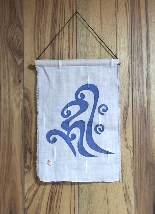 部屋に飾ってある梵字。お遊びで染めたもの。