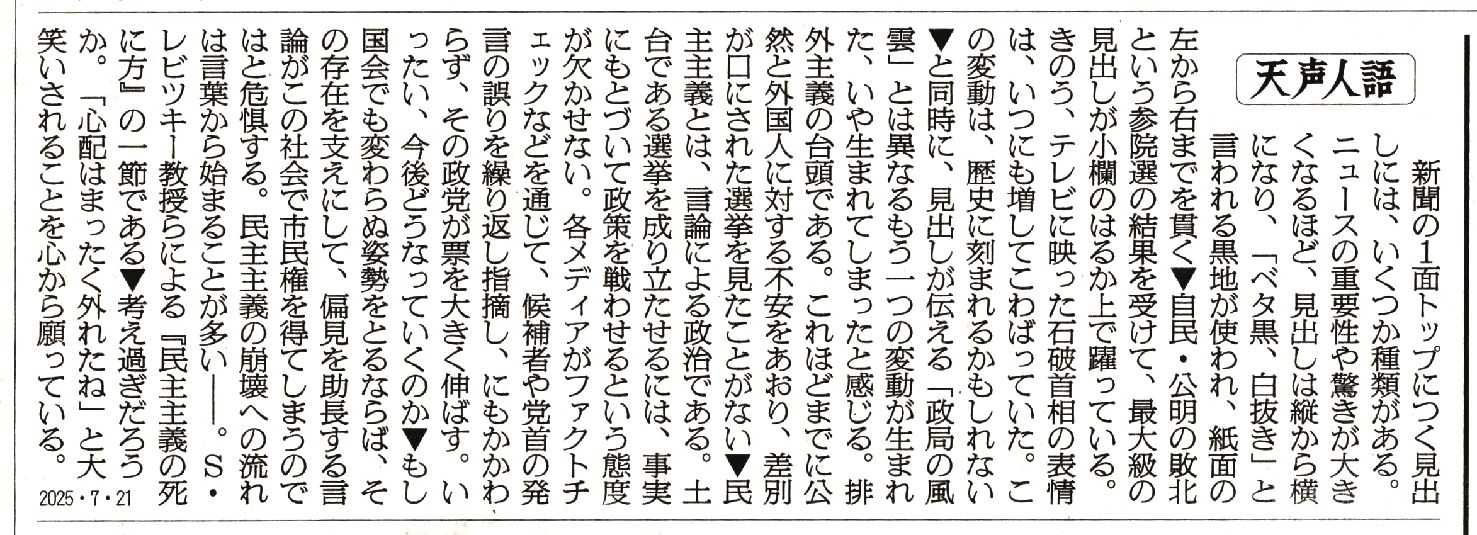 拡大します 最近の朝日新聞「天声人語」は腰砕けの感があり、末尾で言葉を濁すことが多い。