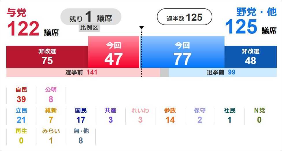 結果は、「自公大敗 過半数割れ」。SNSを駆使してトランプの真似をし、世界の内向き・自国主義を倣って、何も知らない若者層や無党派層を取り込んだ「参政党」が大躍進。自民に嫌気がさした保守派の受け皿として「国民民主党」が議席を伸ばした。