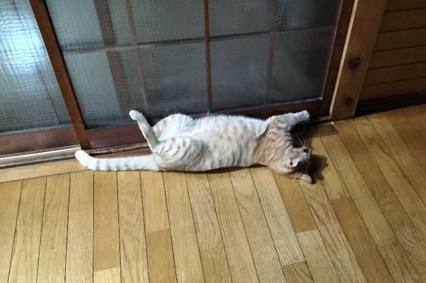2階で寝ていたアランが暑くなって、下りてきたのが昼過ぎ。クーラーの掛かっている部屋は涼しいが、不自然な涼しさには違和感があるらしい。いつも部屋の隅に行って寝転んでいる。なんでこんな格好になるのか。場所が変わっても、どうしてもこういう風になる。