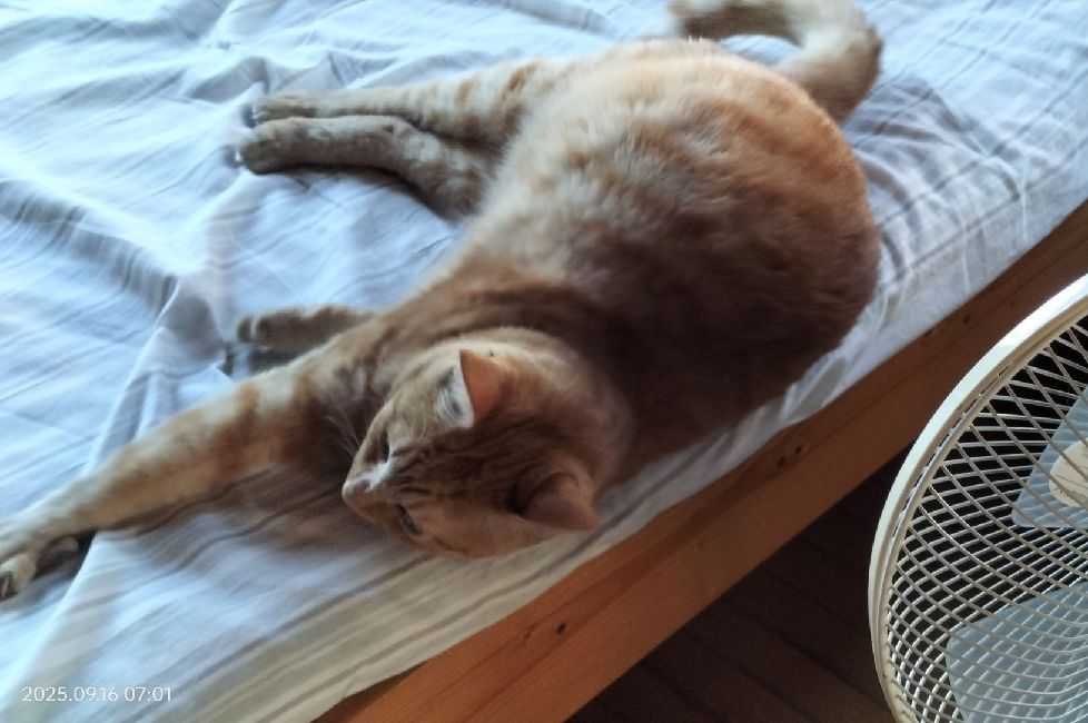 就寝時は30℃あって暑かった。ベッドには来なかったが、いつの間に足元に寝ていた。朝方近くになってからか枕元に移動していた。私が起きるころは、端っこで落っこちそうに。