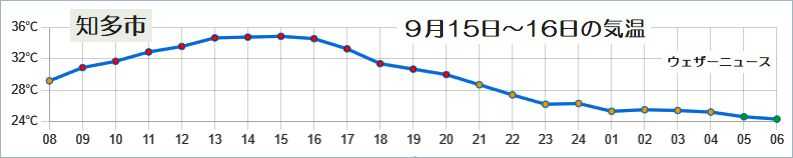 知多市では木曜日までは暑さが残るものの、それ以降は急に気温が下がるようです。いきなり30℃を切ったりする。