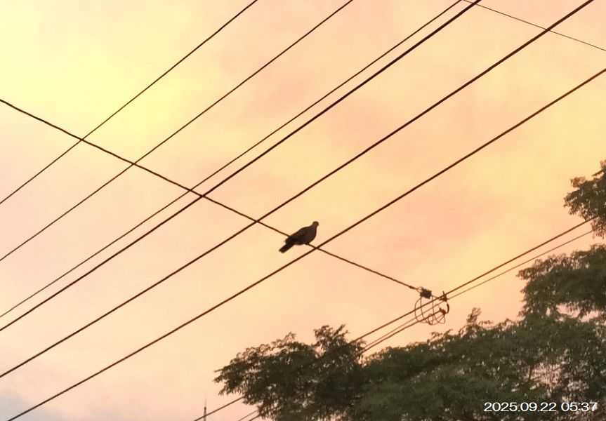 キジバトが2羽仲良く電線に。カメラを向けたら一羽がサッと・・