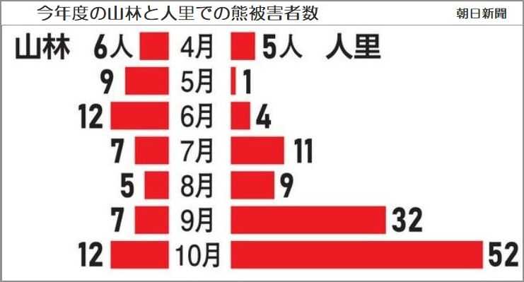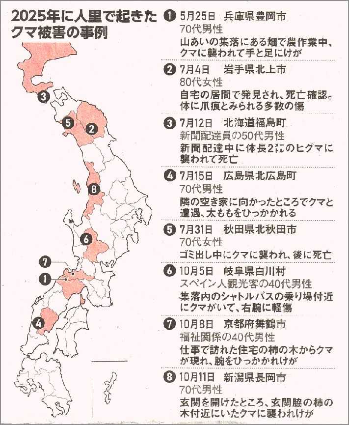 全国で、当然ながらほぼ同じ時期発生している。キノコ狩りの最中など、山野での遭遇だけでなく、家屋や商業施設など、人の生活圏にクマが侵入するケースも多い。散歩やジョギング中、買い物に出た家の前で襲われたり、庭の草取り中に襲われたり・・・
