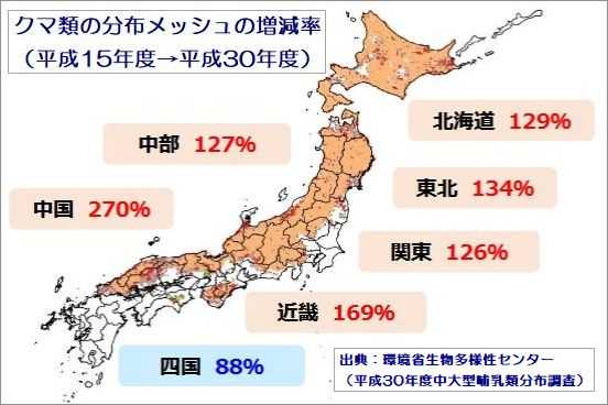 ●低標高域での分布の拡大は、クマ類が人の生活圏にどんどん近づいている。