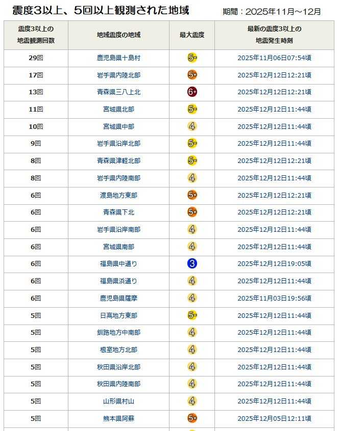 この表の下にズラーと震度3以上の記録が記されている。震度1を入れると無数と言ってもいい数になる。