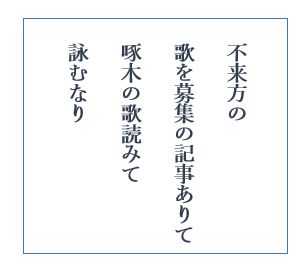 ![]() ♪ 不来方の歌を募集の記事ありて啄木の歌読みて詠むなり 「もりおかの短歌(うた)」を募集中(冬の部 … 12月1日~2月末日)