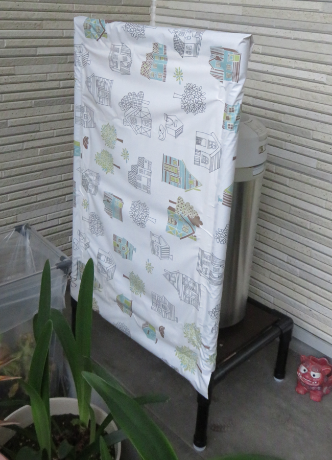 我が家はパナソニックの生ゴミ処理機を軒下に置いて使用しています。 雨が降っても濡れることは無いのですが、台風などの豪雨のときには吹き込んだ雨で濡れてしまうので、そんなときは屋内にしまうか、ビニール袋を上から被せて吹き込みから守っています。 それも、ちょっと面倒ですので雨の吹き込みを防げる台を作っちゃうことにしました。 部材 ・矢崎化工のイレクターのパイプ + ジョイント(プラスチック製を選択)+ サンアロー接着液(50ml) ・処理機を置く場所は、合板を使用 ・アジャスター(脚となるパイプの下に取り付けるため) ・ビニールクロス(雨の吹き込みで濡れることを防ぐため) ・両面テープ(ビニールクロスを貼るため) 【完成写真】 ![]() 処理機を載せている部分のサイズは、45cm x 30cm です。 合板は、園芸用支柱の置き場所を作成したときに余ったペンキを塗りました。 吹き込みの雨を防ぐ為に、外側にイレクターで枠を作り、ビニールクロスを両面テープで貼って盾のようなものを作りました。 処理機より、20cmぐらい高くしてあります。 また、処理機から出てくる熱を避けるために、処理機と盾の間は10cm程空間を取れるようにしました。 外から見ると、こんな感じに見えます。 見えるのはビニールクロスの柄だけですので、柄が飽きたり、汚くなったりしたら、ビニールクロスを張り替えれば良いので簡単です。 ![]() これで、吹き込む雨から処理機を守れる!・・・と思います。 お気に入りの記事を「いいね!」で応援しよう