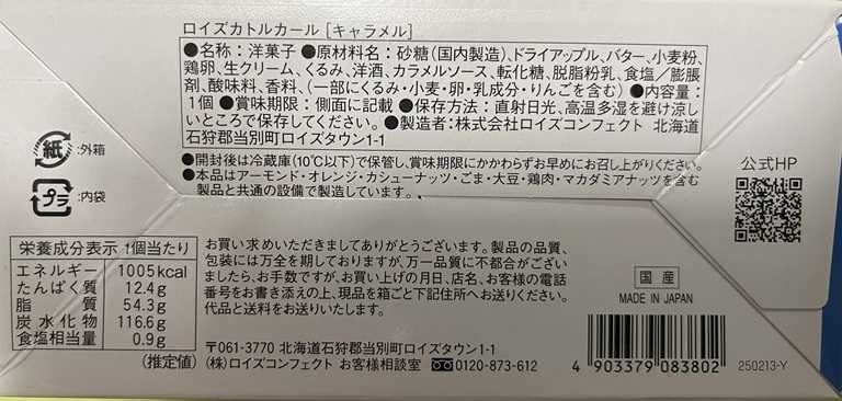 ロイズ(ROYCE’)の期間限定、ロイズカトルカール(キャラメル)です。 ![]() もう終わっているけれど、ブルターニュフェアか何かで作った商品のようです。 ![]() 原材料は上記の通り 1個あたりのカロリーは1005キロカロリーです。 ![]() りんごとくるみをちりばめ、生地は丁寧に煮詰めたキャラメルを練りこんでいます。 しっとり具合を大切にするために、しっかりパックされていました。 ![]() しっとり やわらかくてほろほろ、、、 刃でおすとくずれてしまう。手前にひくように(刺身のサクを切るときみたいに)ナイフを動かすように、、、と言われました。 ![]() 一口目はキャラメルの甘さがきます。 ブルターニュ産の塩味が甘さをひきたてているともいえるでしょう。 ![]() その次にはバターのコク、乳製品らしい味わいが口のなかをまとわりつきます。 くるみがやわらかい食感にアクセントをあたえています。 ![]() リンゴはリキュールにつけこんでいるそうで、、、 なんだか高級なお味のするケーキでした! 魔のデブアイテム、ロイズのポテトチップ(チョコレート)の記事はこちら!抹茶チョコレートの記事はこちら! お気に入りの記事を「いいね!」で応援しよう