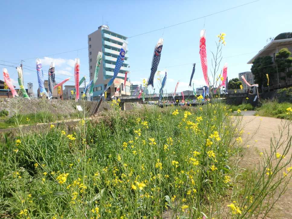 この日はよく晴れて、青空に真鯉、緋鯉などが泳いでいました。 なお私は、子どもの頃から、黒い真鯉がお父さん、赤い緋鯉がお母さんで、子どもたちは青色や緑色の小さな鯉だと思っていました。しかし童謡『鯉のぼり』では、「ちいさいひごいは こどもたち」と歌われており解釈が異なるようでした。ウィキペディアでは以下のように説明されています。