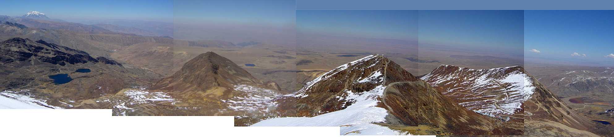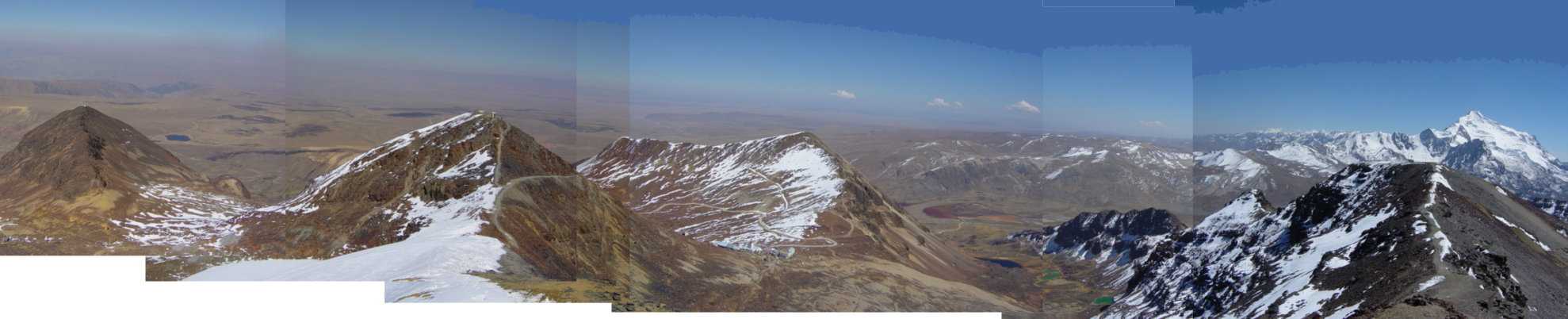 スキー場ロッジ(5180m)からチャカルタヤ峰(5395m)までは標高差215mで僅かなように見えますが、5000m以上の高所ということもあって呼吸を整えながら慎重に登りました。すでに、ソラタ、チチカカ湖・太陽の島、コンドリリ峰のトレッキングで4000~5000mの高所に慣れていたこともあり、参加者全員、無事に登ることができました。 ちなみに、2004年12月にチベット・セチラ峠(セチ峠、4560m)を訪れた時、同時期に別のグループでここを訪れた高齢男性が車を降りて2~3歩歩いただけでバッタリ倒れてそのままお亡くなりになったという話を聞いたことがあります。いくら健康体でも、高所順応せずにいきなりチャカルタヤ峰を登ろうとしたら同じような危険があることは間違いありません。 ※以下の写真のうち横長のパノラマ写真(つなぎ写真)は、写真を右クリックして別ウインドウで表示すると、原サイズに拡大することができます。 【マップ再掲。『イリマニ峰』は『イイマニ山』と表記されている。】 ![]() 【左のピークが頂上。右端はイリマニ峰】 ![]() 【登頂】 (背景はワイナポトシ) ![]() (背景はイリマニ峰【マップでは『イイマニ山』) ![]() 【以下、パノラマ写真(つなぎ写真)。右クリックで拡大できます】 (北方向、ワイナポトシ方面) ![]() (北~南東方向。ワイナポトシからイリマニ峰まで) ![]() (南東から南方向。イリマニ峰から旧スキー場まで) ![]() (南から時計回りで北方向。旧スキー場からワイナポトシまで) ![]() お気に入りの記事を「いいね!」で応援しよう
