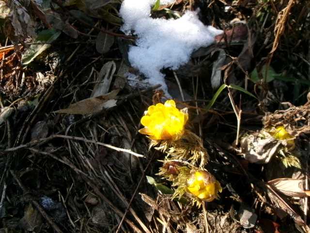 今年も福寿草が咲いた!冬枯れの中雪の合間から顔を出す黄一点、「おお~!可愛い!」閉ざされた冬の山の中で何とも心が癒される小さな小さな福寿草!