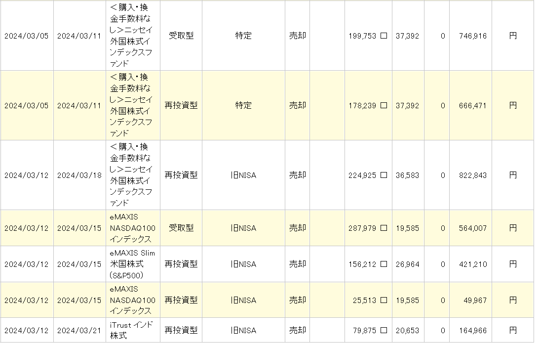 ![]() ![]() ![]() お疲れ様です ご訪問頂きましてありがとうございます。さあ、FIREおっちゃんは既に年金受給を開始する年齢ですね よく考えますと今更フルインベストはいかんじゃないかと?思いまして旧NISAぶんを処分しました。これからは新NISAで投資しつつ他を売却していきます もうお金は十分です(笑) 売却額 4,052,731円 投資額 2,514,833円 利益 1,537,898円 騰落率 61,2% ははは、これって無税ですよ 儲かりましたね 投資を始めて6年 良い時期に投資が出来ましたね 時間とお金が働いてくれましたね あと5年は少しの投資をし楽しみながら過ごしてまいります ここでの暴落は厳しいお歳になったのでね ゴルフと旅行とグルメを楽しみます だはっ アンナラスマナラ ポチっとお願い致します にほんブログ村 にほんブログ村 お気に入りの記事を「いいね!」で応援しよう