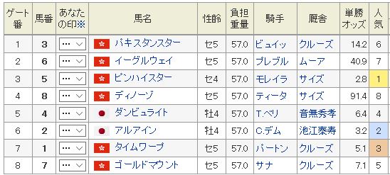 ここは香港勢に軍配か◎ 1 ビューティージェネレーション〇 14 ヴィブロス▲ 8 シンガポールスリング△ 4 モズアスコット△ 9 サザンレジェンド買い目: