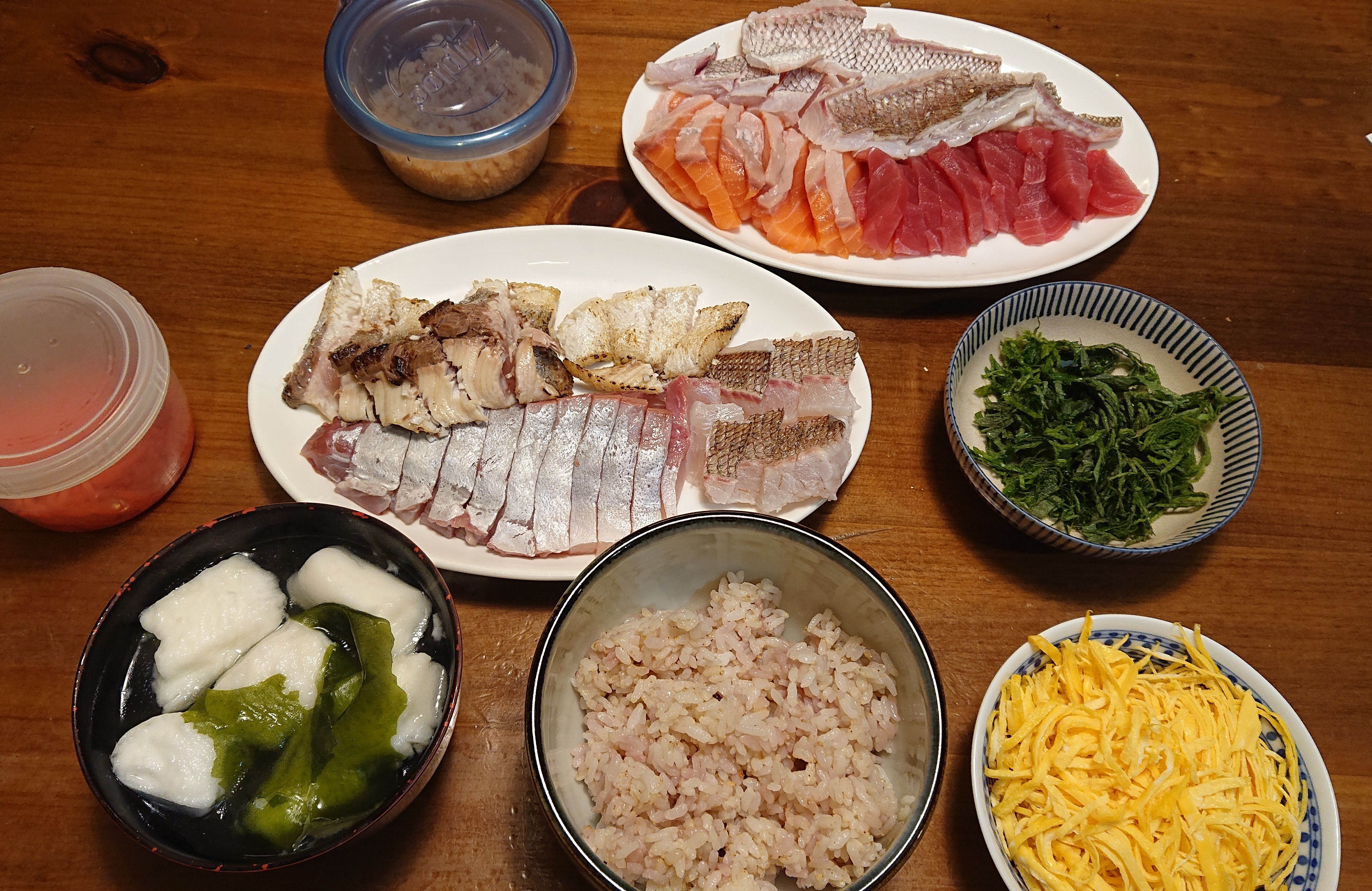 備忘録的なエントリーです。 ![]() 折り紙のお雛様 ![]() 雛祭りと言えば、鯛とハマグリ。 ですが、今回はハマグリが手に入らなかったので、 綺麗な天然鯛をGET。 元々、鯛は少し深いところにいる魚です。 目の上の青がまるでアイシャドーみたい。 背中の青い点々も綺麗。いい形です(^-^)。 (養殖の鯛が背中や頭が黒ずんでいるのは、日焼けしてるからなんですよ。 いけすはそこまで深く大きくできませんからねー) 新鮮な鯛は皮付きの湯引きにすることにしました。 綺麗に鱗を取るコツはスプーンでできるだけ鱗を取った後、 熱湯をかけて、立った鱗をさらにスプーンでこそげます。 ![]() さっと湯引きにした後、残ってる細かいうろこを取って、 氷を入れたボウルに取って冷やしているところです。 今まではチラシ寿司が定番でしたけど、食べ盛りがいるので すし飯の海鮮丼にすることにしました。 具は自分でとるバイキング方式。 刺身で食べるもよし、どんぶりにするもよし。 ![]() 具は上段、左から 海老のそぼろ タイの湯引き、マグロ、サーモン 中段、左から 紅ショウガ、ハマチの焼霜造り、ハマチの刺身、シソ 下段左から タイのアラと昆布でとった出汁に、はんぺんとワカメを入れておすましにしました すし飯(少し色がついているのは黒米を入れて炊いたから) 錦糸卵 一人前にするとこんな感じ ↓ ![]() 美味しかったです! 御馳走様でした!!