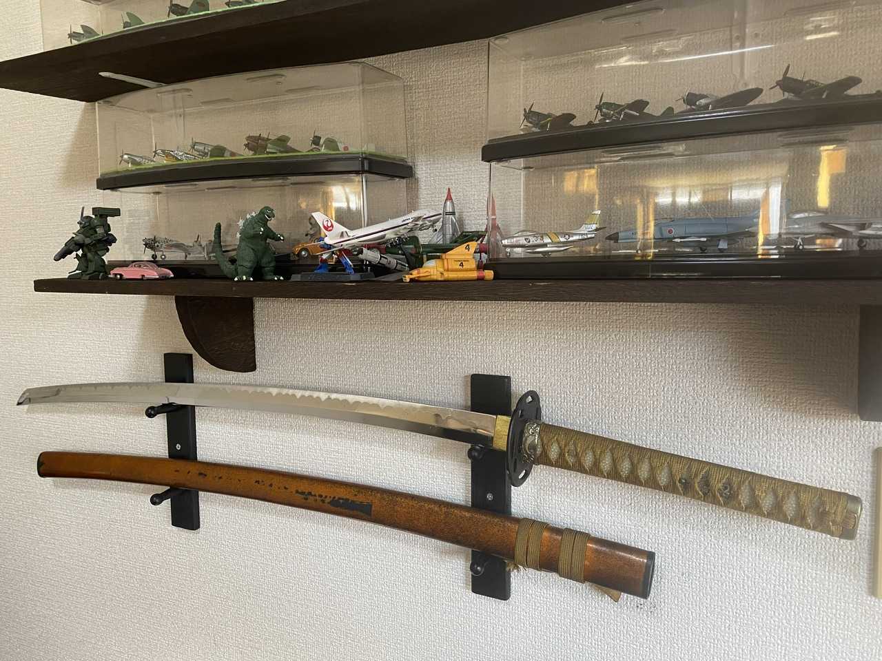 一同集合となったことがある。その叔母さんの旦那さんが 床の間に、モノホンの日本刀を飾っていた。 (勿論、許可証は持っている) その妖しげな刀の輝き、ちと怖いと思うほどで イヤ〜オイラには縁がないかな🤔 と この時は、あんまり興味が湧かなかった 😅 そう言いつつも何かのスイッチが入って、ちょくちょく 模造刀が欲しくなることがあったのだけど まぁ「どこに飾るよ😅」って言うのが本音で、ヤフオクで 眺める程度にしといて、入手は諦めていた😵 フィギュアを集めだしてからは、鎧兜が欲しくなって ミニチュアながら「武田信玄」の鎧兜と刀のセットを入手。 ![]() これで、自分に納得させていたのだけど... しかし、しかしである。僕の中の「侍」が時々、発動して 刀を抜いてみたくなるのだ(なんのこっちゃ?) 😂 模造刀もピンキリで、おもちゃみたいなのから亜鉛合金で ずしりと重く、刃文が妖しいのとか....刃文は模造刀の 見どころのひとつ...らしいが、確かに魅せられる💦 因みに居合刀と模造刀の違いすらも、僕には分からない💦 居合刀は、その使い方もあって模造刀より軽いのかな? 柄の部分も居合刀は木製で、刀を振っても割れたりは しない様に作られているのだそうだ。 全然詳しくない素人だけれど、結局、鞘の鯉口が割れていて 鍔もサビサビ、刀自体も傷があるヤス〜い訳あり品を入手。 ![]() ![]() 鯉口が割れてるので、鞘が刀から勝手に抜ける! 本物なら、マジ危険⚠️ と言うわけで早速、鍔の錆落としと 鞘の補修を素人ながらネットを参考に取り敢えず試みた。 ダイソーでパテと艶消しクロのラッカースプレーと ホームセンターで厚さ1mmの板、エポキシ樹脂の接着剤を 買って来た😅 ![]() まずは、鞘の入口に板を接着して、固まったところで刀を 入れると、スポスポだった刀が今度は全然入らない。 1mmの板では厚すぎで、結局はゴリゴリと紙ヤスリで 削ってどうにか収まった😅 やや、キツめだが良かろう💦 ![]() そして今度は、刀にマスキングしてパテがくっつかない様に 養生した状態で刀を挿して、欠けた鯉口をパテを塗り込んで 形を整えつつ、パテが固まるのを待つ。 その間に鍔のサビも落として(なかなか激しいサビで大変😰) ラッカースプレーを塗る。コレはかなりの暴挙だが オイラは飾るのがメインの目的なので、コレで良いのだ 😅 ![]() さて、鯉口のパテも固まったので、紙ヤスリで形を整えて こちらも、ラッカースプレーを塗った。 ![]() 果たして、素人補修だけど、いい雰囲気になった✌️ ![]() まぁ、激しく抜き差ししなければ、大丈夫でしょ🤣 と言う訳で、一人でご満悦なのである😋💫 ![]() ![]() アレ⁉️ もう一本、あるのは何かって❓ 実は先走って、あんまり調べもせずに「片手打ち」なのか 少し短い模造刀を、買ってしまった 💦 部屋で振り下ろしてみるには、短い方が良いけど.... 結局、長い刀が欲しくなって、ワケあり品を買い直した💦 刀掛けは、ダイソーで買って来たものをDIYしたものだ✌️ (こう言う智慧がなぜ、仕事にも向かないのか....😭) 最近、開き直って、自室の壁に棚じゃの何じゃのと ネジで縫い付ける暴挙を犯しているが「煩悩の間」を 如何に「癒しの間」に変えるかは、ストレス多きこの世を 健全に生き抜く為に必要だと、肯定している次第である⁉️ お気に入りの記事を「いいね!」で応援しよう