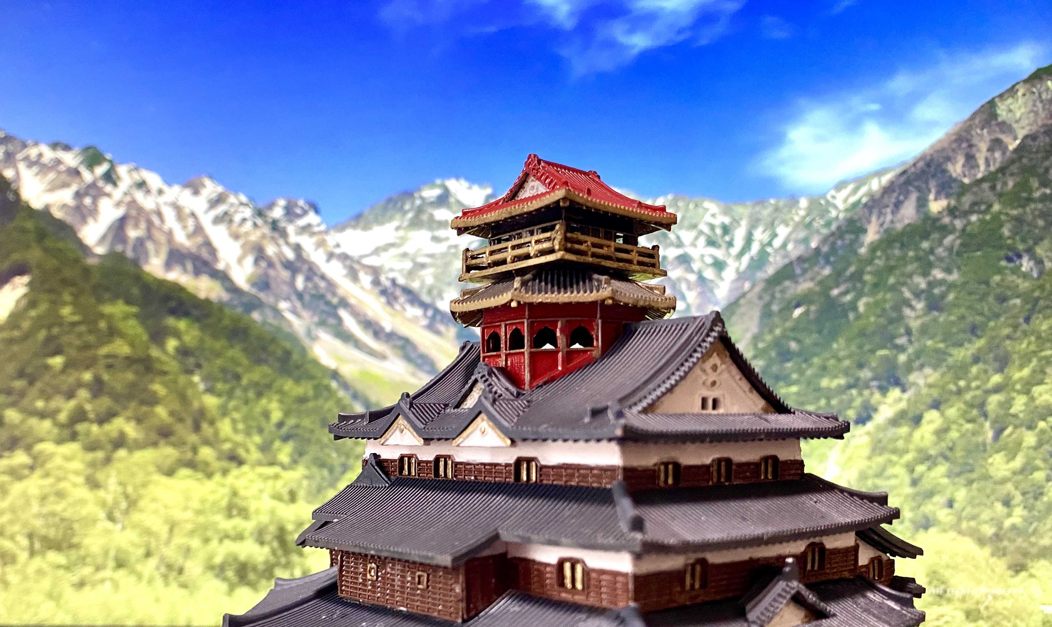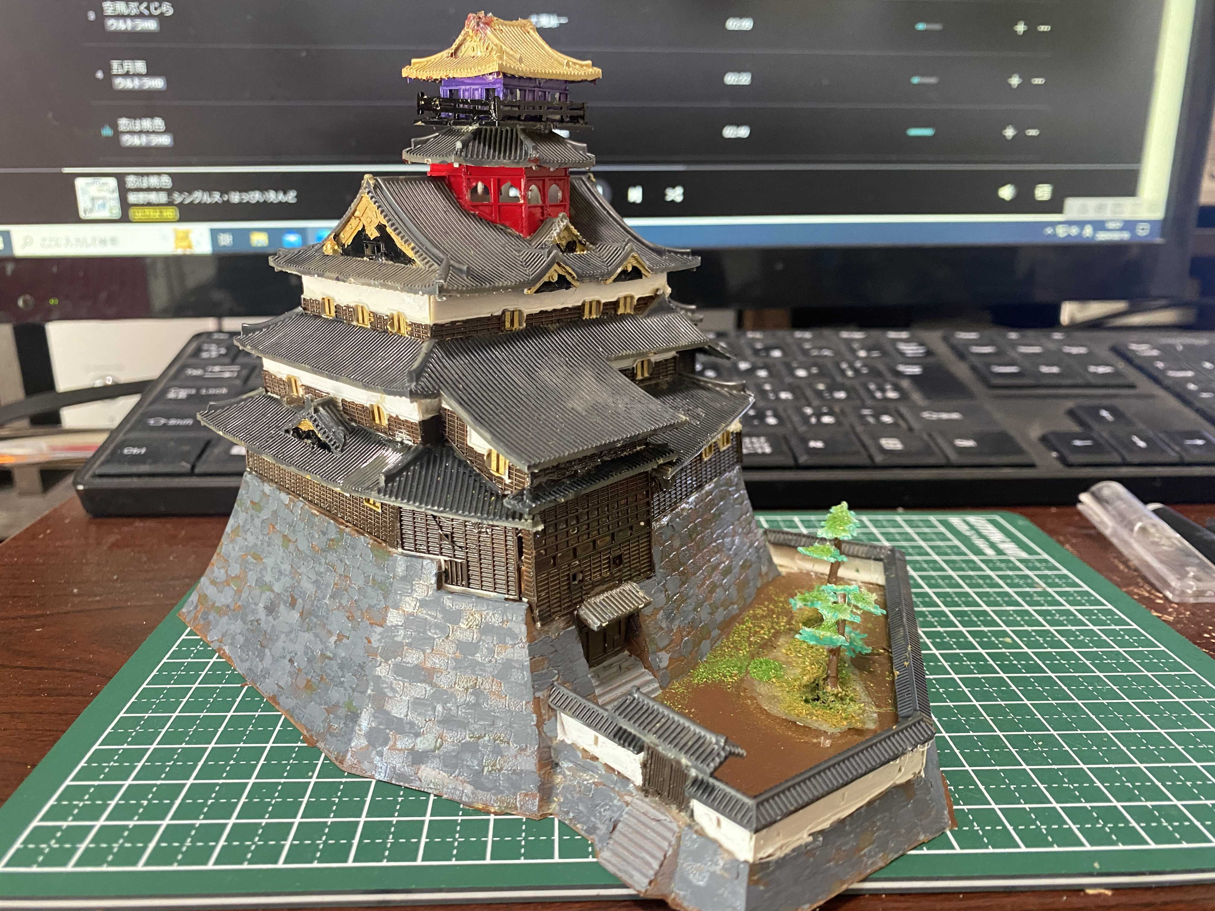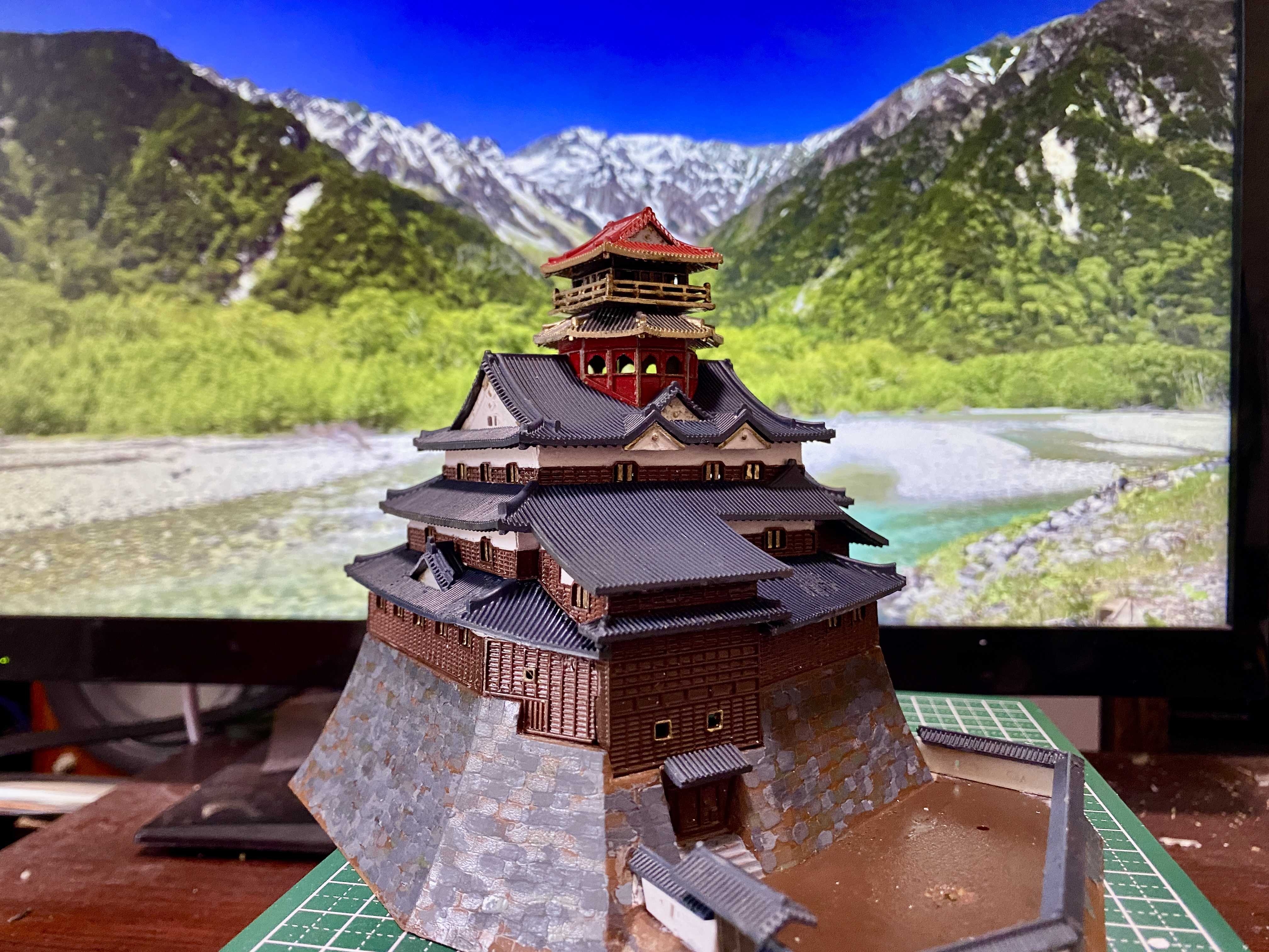「ババを引いた」と衝撃で目が眩んだが、ここまで出来れば 良いと思うけど ꉂ🤣w𐤔 シャチホコを載せたいけど、ついて 来てないので、いつか代用品を自作して載っけよう🤔💭 これでも「即決1万円」なんて値段はつける自信がオイラには ないけどね 🥹՞ 下の画像は、届いた直後の状態だけど、画像では見た目は 良くて「味がある」のだけど、現物は...😵💫➰ なんか、コレにカネ払った自分が間抜けに見えるので、 モデラー魂を見せて見た訳である💪❤️🔥 塗料やらマスキングやら痛い出費になったと、次男坊に 愚痴ったら「自分で作れるなら、他人から買ったらイカン」 と言われて、なぜか思わず納得してしまった🫠💦 オマケで、意味なく上高地からのアルプスを背景にして お気に入りの上層部分の画像を載せて、今回の作業は終了😉 「オレの安土城」の完成である✨