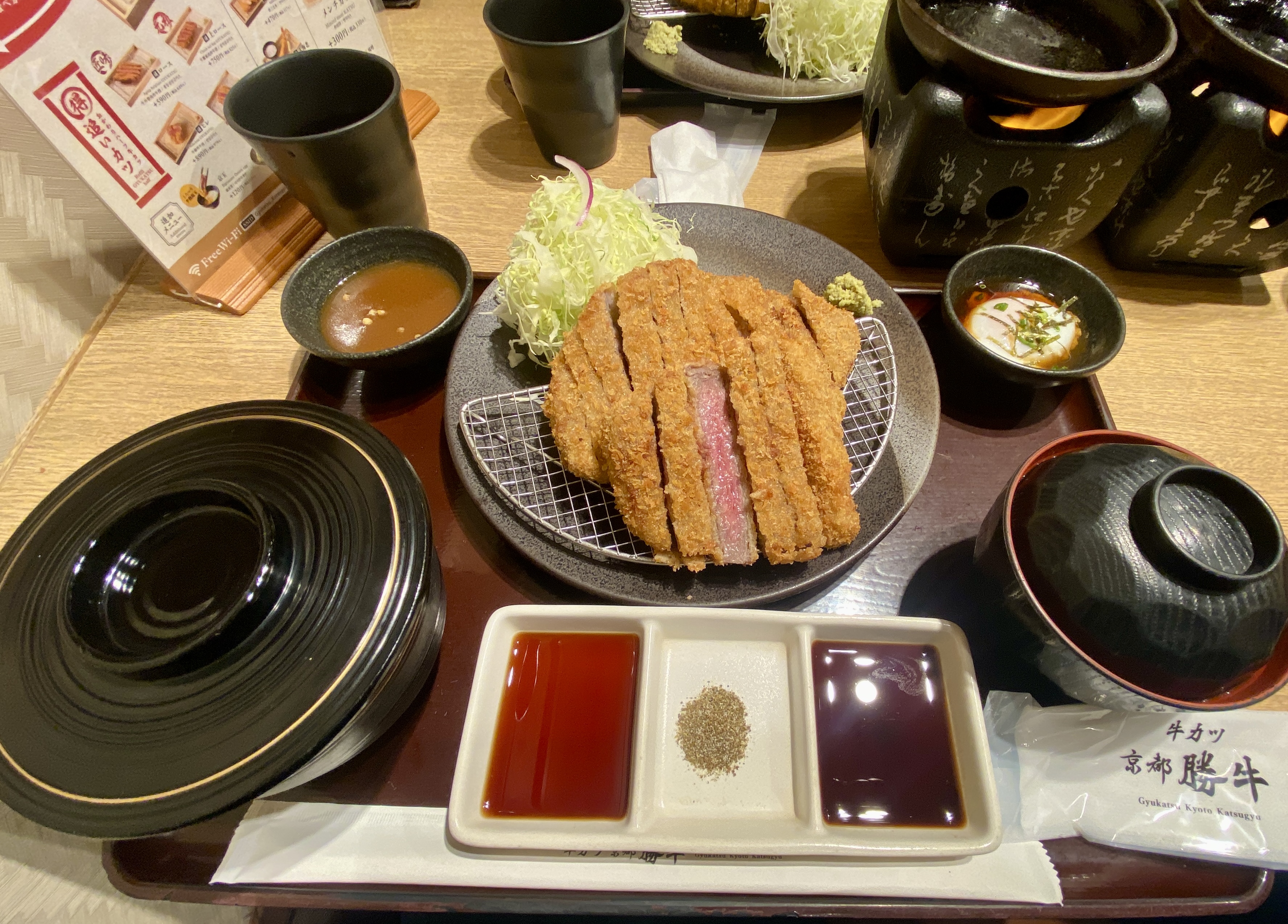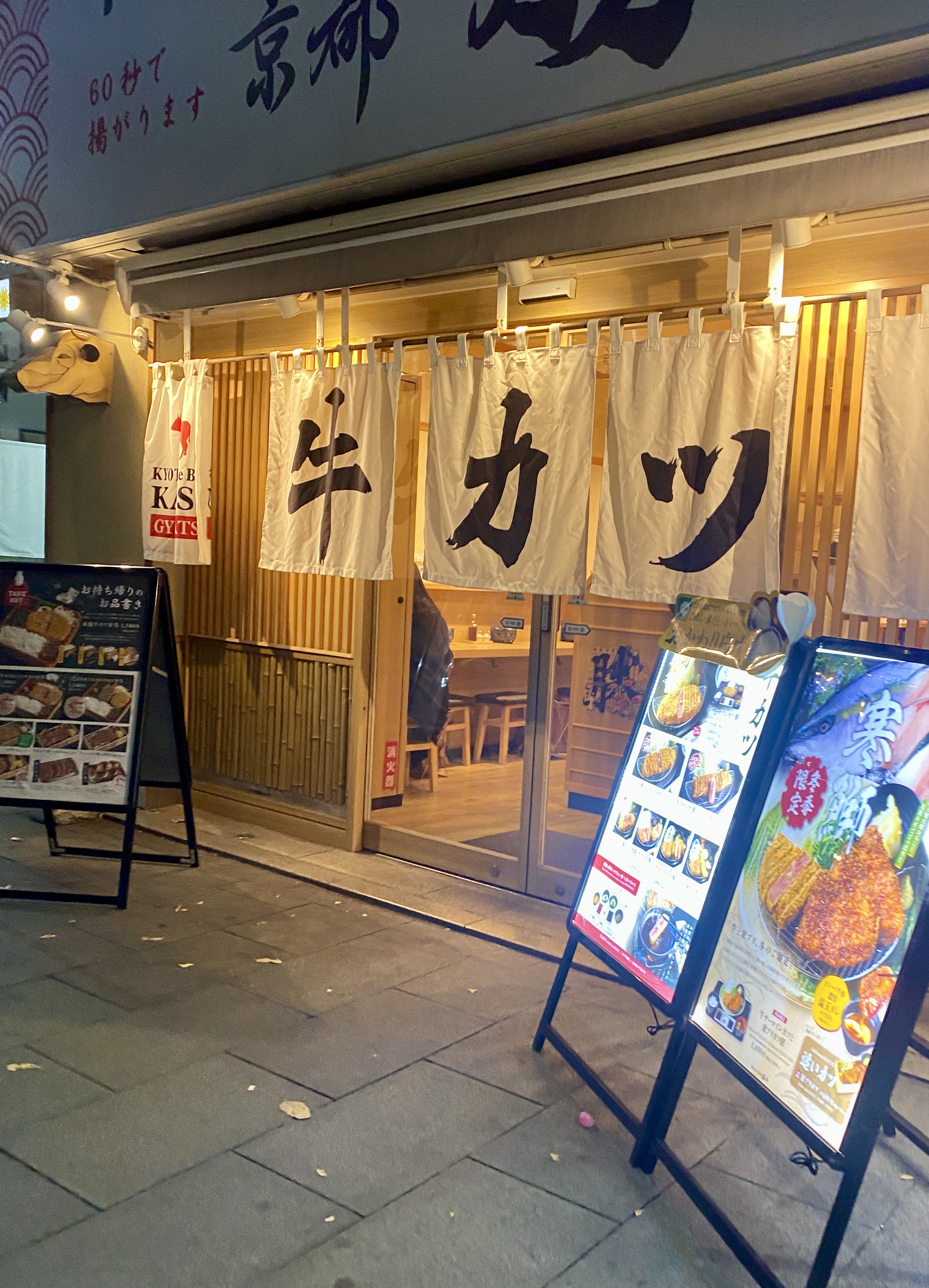 また北九州市若松に出張している✋ 客先は火気厳禁の倉庫なので寒い🥶 おのずと晩メシには リキが入る❓ ホテルは小倉駅付近のアーケードの中にあるから、歩いて 軒並み、色んなお店を見物して歩く。 何にしようか~? 悩むが、美味しそうな豚テキちゃん🐽 「豚ステーキ専門店 B」このBは、豚の鼻のBらしいな...ꉂ🤣𐤔 1日、100食限定なんだとか😅꜆꜄꜆ いやー!美味そう🤤 ラード吸収で寒さを乗り切ろう!! 豚ミンブーを取って満足しながらコンビニを探していたら 牛カツの店を発見!! 連れに「次はココだっ!」と宣言して、明日への労働意欲を 掻き立てる‼️ 翌日は出張最終日。戸畑にいる長男の仕事終わりを待って いざ!出撃である😅꜆꜄꜆ 連れと長男の三人で晩御飯である🍴 「牛カツ京都 勝牛」どうやらチェーン店らしいので言うほど 自慢にはならんかな❓😅 鰤カツも気になったが、今回は スタンダードに、温玉付きの牛サーロインカツ京玉膳だっ‼️ 美味い😋美味いぜ🤤 左上の小皿はソースかと思ったら、 カレーソースだった😅꜆꜄꜆ 帰りに、デザートで「鳴門鯛焼き本舗」で鯛焼きを買って 今日は超満足の晩御飯であった‼️