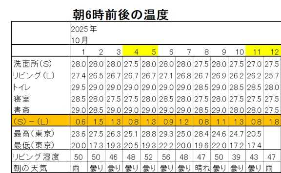 ![]() ![]() (6:15頃) 今朝の温度(6:00) 室温 リビング:25.7、 洗面所:27.5、 湿度(リビング):47、 (昨日の外気温 東京、最高気温:20.5、最低気温:17.4 本日の天気予報 晴れ時々曇り 最高気温: 25、最低気温:17)