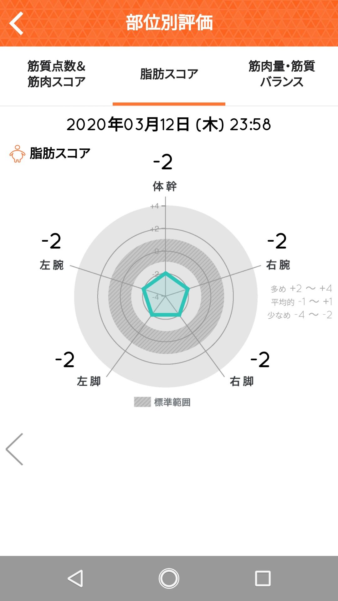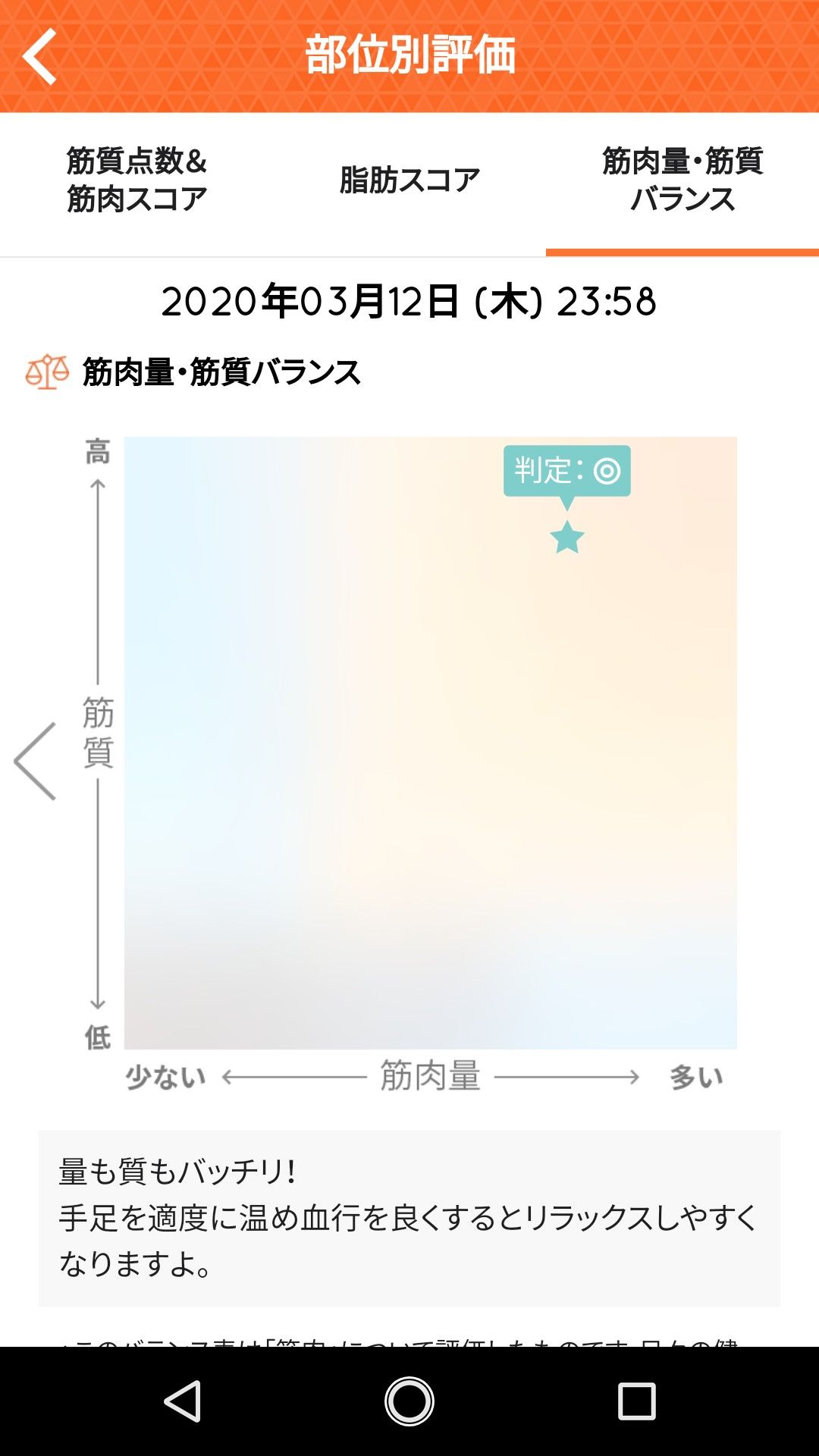 ほんのちょっとだけど、体重は落ちてる! (筋肉量も落ちてるけどそこは気にしない・笑) 先週55キロをきって喜んでいたのもつかの間。 油断してあっという間の体重へ。 今週はもう、ダメかと思ってたけど・・・ 良かった、良かった♪ ![]() ![]() ![]() しかし、お腹は相変わらず出ている(笑) ま、そこはいっか。 そしてこんな表もあるの、忘れてた。 ![]() ![]() 体幹弱いなー ![]() え?脂肪スコア、これでいいの?? なんか数値と見た目の印象が違うのですが。 お腹・・・ポニョポニョしているんだけどなー。 いいの?本当に?? ![]() なんか、よさげな位置にいるじゃない?? 前は判定が◎ではなく、○だったよーな、そうでないよーな。 金曜日の夜にこのデータを比較しようかと思ったんだけど、 そしたら金曜日の夜は飲めないのよね。 なので木曜日に変更(笑) 飲むなら金曜日の夜がいい。仕事お疲れ様!も兼ねて飲みたい(家でだけど) という事で明日の夜はちょっといただこうかな?(笑) お気に入りの記事を「いいね!」で応援しよう