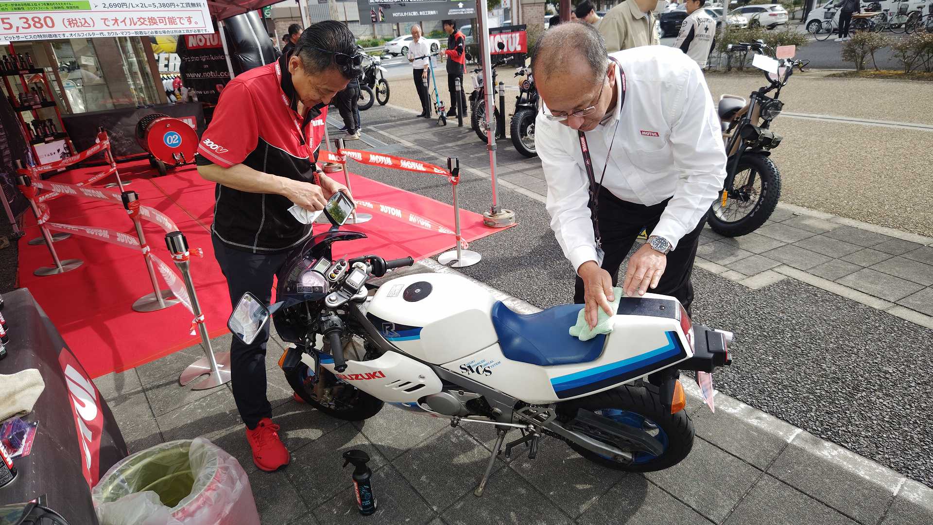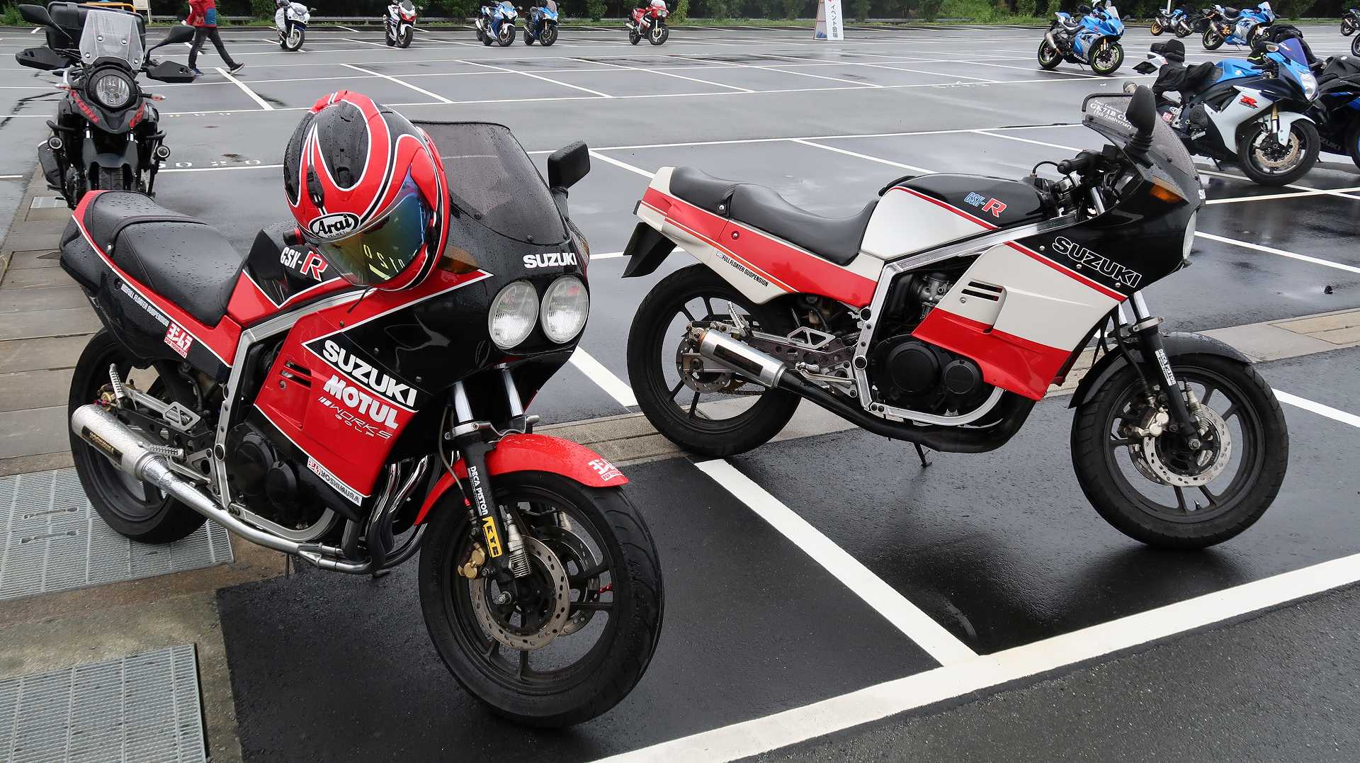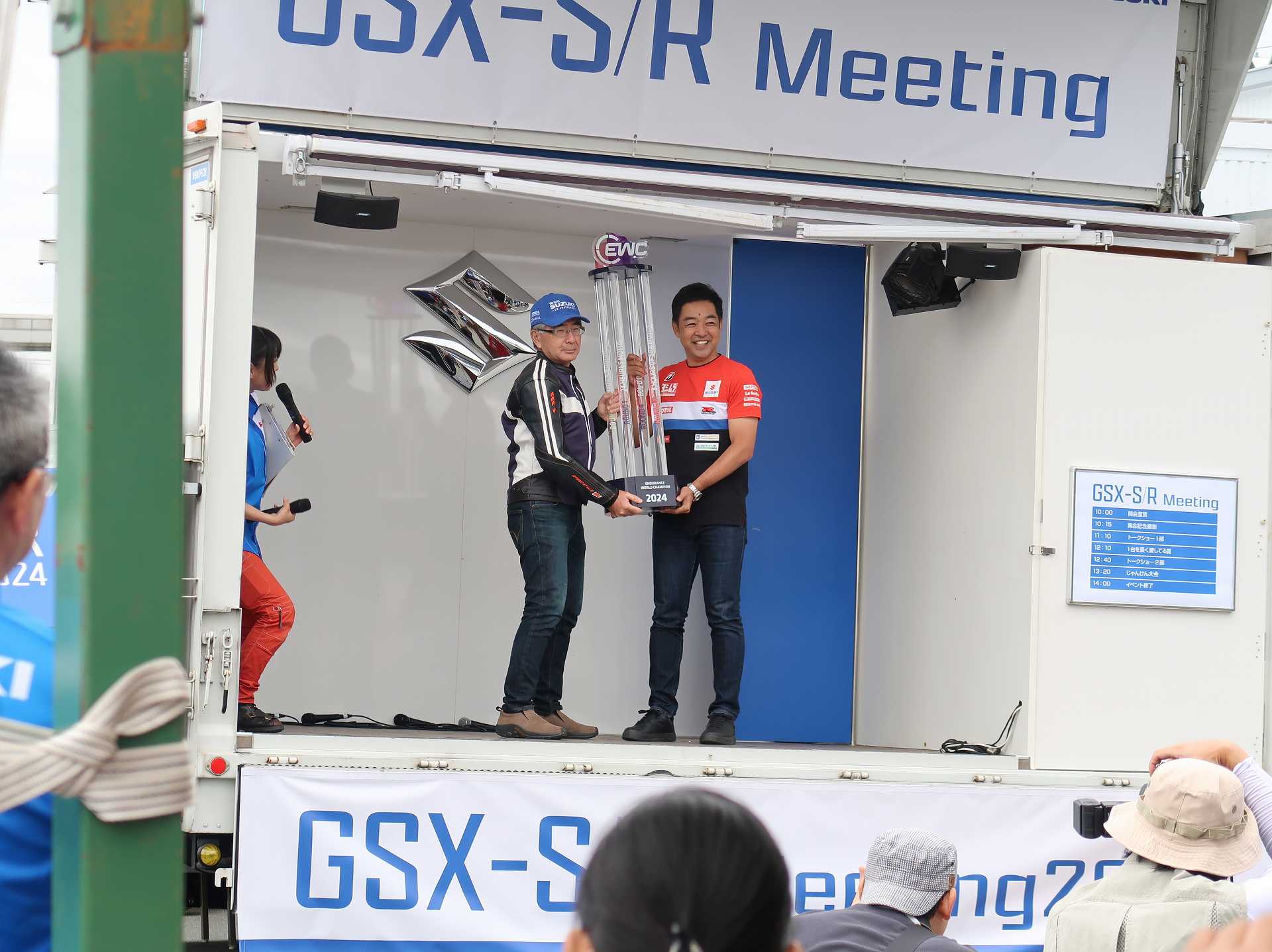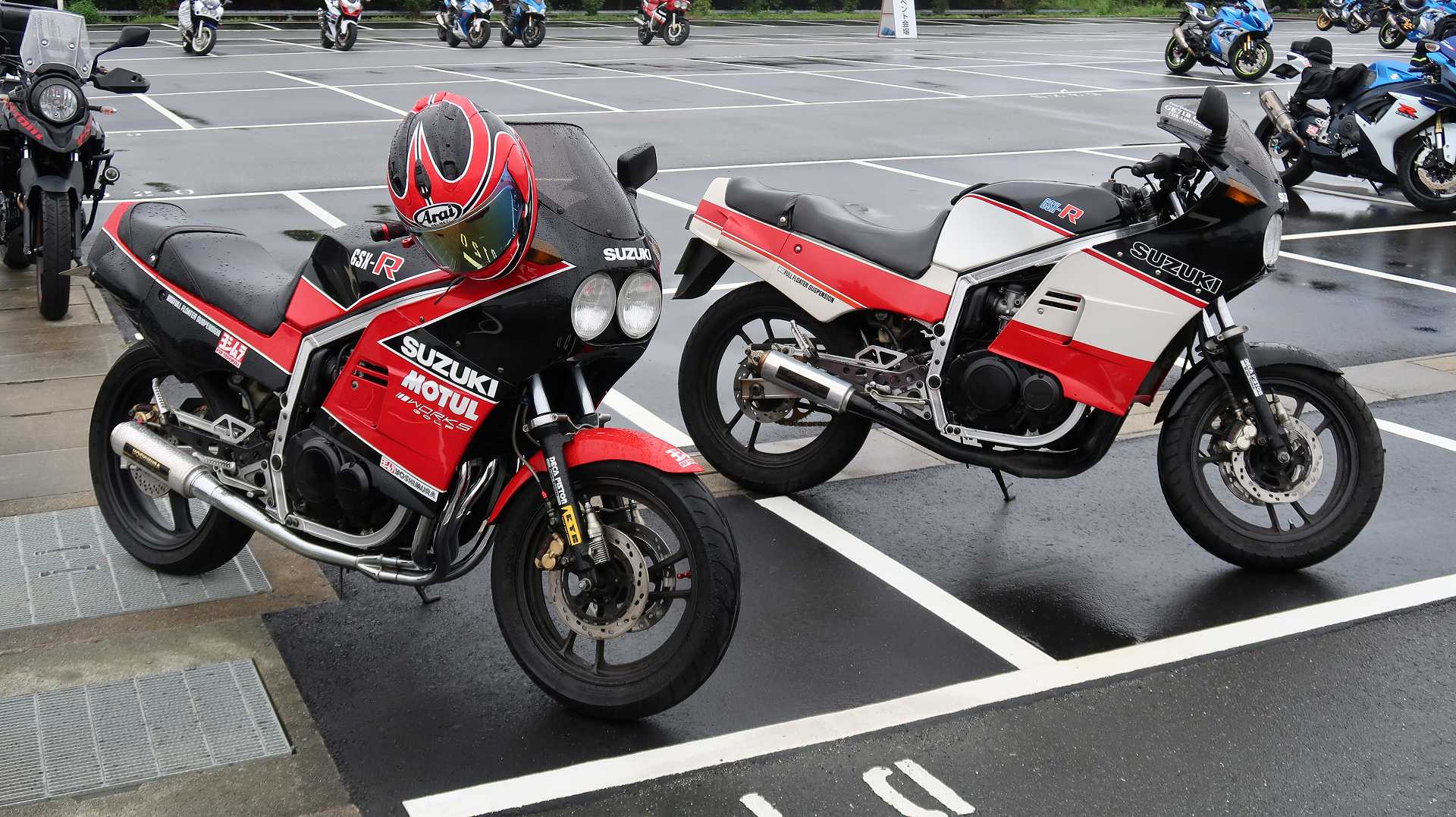 高速乗って、浜松に 前に、2台走ってるなあ、、、GSX-R??って思って、抜いてみたら、GK71F 八風の糸さんの赤白だなあ、、もちろん前を走ってるのは、ひで爺さんのWW 9:26 ってことで、後ろについて、会場に ![]() ![]() 10:04 開会の挨拶 撮影禁止って、サイトに書かれていたのに、まったくそんな気配もなく、皆さん、バシャバシャ撮影されてますね。。。 それなら一眼持ってきたら良かった。。。 駐車場で、色々と撮影したいGSX-Rあったのに。。。 この駐車場、今回のイベントのために、砂利だったところを、夏休みに舗装したそうです ![]() GSX-Rが販売されて40周年との言葉がありました 国内で400が発売されて40周年 その次の年にグローバルで (まあ、400は、海外でも売られてましたが・・・・そのこと、知ってるかは??と社員の一人の方が。。。) ヨシムラのトロフィーを両社長が! ![]() ![]() ![]() ![]() 11:17 ヨシムラのメンバーと、佐原さんのトークショー 24時間は、やっぱり長いそうですね。。。 ![]() ![]() 11:36 CN CHARENGEのトークショー 日本のバイクなので、小さくて、腰が痛くて、予定より早く交代した話とか、生形さんとの体格差とか ひたすらプレッシャーかけられてた話とか、他にも、色々と楽しい話ありました 津田さんがテストしたときに、ブレーキパッドがまったく使い物にならなかったけど かなりきつくいって、2週間で、通常のものと、大差ないところまで使えるようになったと ここには来てないからと、サンスターさんの名前だして、ダメだしの話されてましたね チームの皆が、トップテントライアルの日が佐原さんの還暦の誕生日で、その日に、赤いTシャツを作ってくれて、それをトップテントライアルの時に着る予定だったが出れなくて残念だったと それを今日は一日着てますってことでした ![]() ![]() ![]() 私はやっぱりでかくて、目立つようで、80's Meetingの仲間たちが、たくさん、声をかけていただき。。。 色々とお話させていただきました ![]() 12:15 GSX-S/Rミーティング 一台を長く愛している賞 条件は、自己申告のみ、GSX-Rで、新車から長く乗っている方 もちろん優勝は、我らがGK71B CLUBのCHOKUさんです! GSX-R HBを新車で購入40年間は、一人でした 他、1985の750の方とか、色々と表彰 CHOKUさんに、たくさんの報道陣がかこみで、撮影されてる姿は、むちゃくちゃ受けました そして、表彰者が一堂に並び。。。 う~む、親方たちの土俵入りですかね。。。。 ちなみに、私は、新車からという条件でダメでした 35年なんですけどね~ ![]() ![]() ![]() ![]() ![]() ![]() ![]() chokuさんのHBは、こちら 静岡県在住のchokuさんのGSX400R-C ![]() ![]() chokuさんのコメント(2004/04/05) ご無沙汰しております。2月にGK71B CLUBへのメールをさせていただいた、 choku と申します。 返事を頂いたにもかかわらず、何の連絡もせず失礼いたしました。 GSX-Rの出先での最近の写真が見当たらなかったので、 自宅で撮ってみました。 余りきれいに撮れていませんが、よろしければHPで紹介願います。 現在は、昨年の夏以来ほとんどエンジンをかけていなかった為、 キャブがオーバーフローをおこして、掃除が必要な状態です。 ここ数年はほとんど乗らない上に、自分では洗車位しかしないし、 ドノーマルですので、整備の苦労とかは自分では余りして無いのですが、 だんだんパーツの欠品に悩みだしているところです。 今年はGSX-R誕生20周年ですので、何かお手伝いできることがあれば、 お手伝いさせていただきたいと思います。 今年も渚園には行く予定ですが、皆さんと集まる機会になればと思っています。 いつまで可動状態を維持できるか判りませんが、末永くよろしくお願いします。 ------------------------------------------------------ そうです、初期メンバーのchokuさん 20年前、スズキミーティングでの、GSX-R20周年の時にも参加され、横内さんともお話してます。 2004/07/17(土)-19(月)天竜-袋井 GSX-R 20周年記念 GK71B CLUB MEETING 左端がchokuさん、右端が横内さん ![]() 辻本さんの右側がchokuさん ![]() 色々とブースのほうも見てみます 12:20 ![]() ![]() ![]() MOTULさんのブースで挨拶 ちゃんと、私のことは、皆さん覚えていていただけました NAPS京都八幡店でのMOTULイベントで、皆様に挨拶と、80's Meetingの紹介をさせていただき Mar 30, 2024 GAG125で、NAPS京都八幡店 「MOTUL JACK」に、クリーナーで綺麗にしていただきました! #GAG #NAPS #MOTUL ![]() Mar 30, 2024 HBΓで、自賠責入って、再度NAPSに。MTオイル交換していただきました。 #MOTUL #HB #RG250Γ #GJ21A #NAPS ![]() Mar 31, 2024X 今日はGJ21Bの方のオイル交換。辻本さんシュワンツのサイン入りタペストリーと写真を撮らせていただきました。 #村瀬春香 #密照幸映 #NAPS #MOTUL #GJ21B #ヨシムラ #RG250Γ ![]() ![]() ![]() ![]() Mar 31, 2024 GJ21Bと2024 Ambassadeur de MOTULのお二人との写真を撮らせていただきました。 #村瀬春香 #密照幸映 #NAPS #MOTUL #GJ21B #ヨシムラ #RG250Γ ![]() 鈴鹿8耐で、企画書をお渡しして協賛のお願いを そして、80's Meeting 2024に、協賛いただきました!! みなさん、本