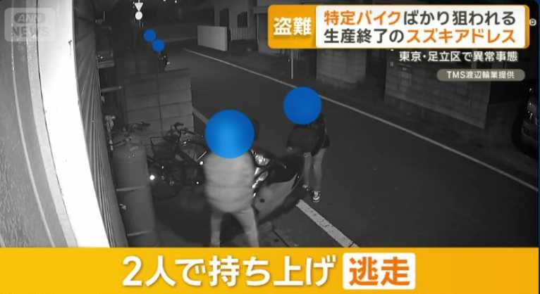 先月6日午前2時すぎ、東京・足立区の住宅街で何かを探すようにうろつく4人組。そのうちの1人が、止まっていたバイクを物色しています。その場で話し合うこと、およそ3分。2人がバイクを持ち上げて運び出し、逃げていきました。