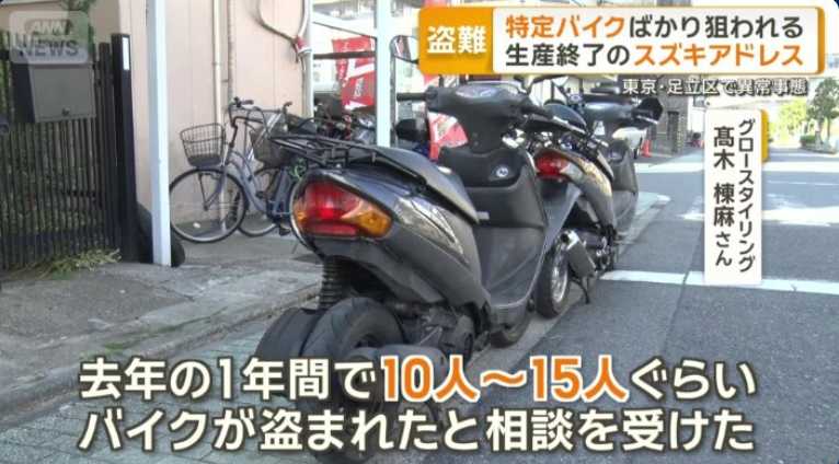 「これがスズキのアドレスV125Gです。去年の1年間で10人〜15人ぐらいバイクが盗まれたと相談を受けた。アドレス以外はほぼいないです」