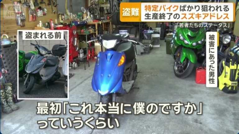「バイクがないということで、(近所の知人から)電話をもらって、防犯カメラを確認したら盗まれていた。盗難が多いというのは聞いていたので、ついにやられたかと」