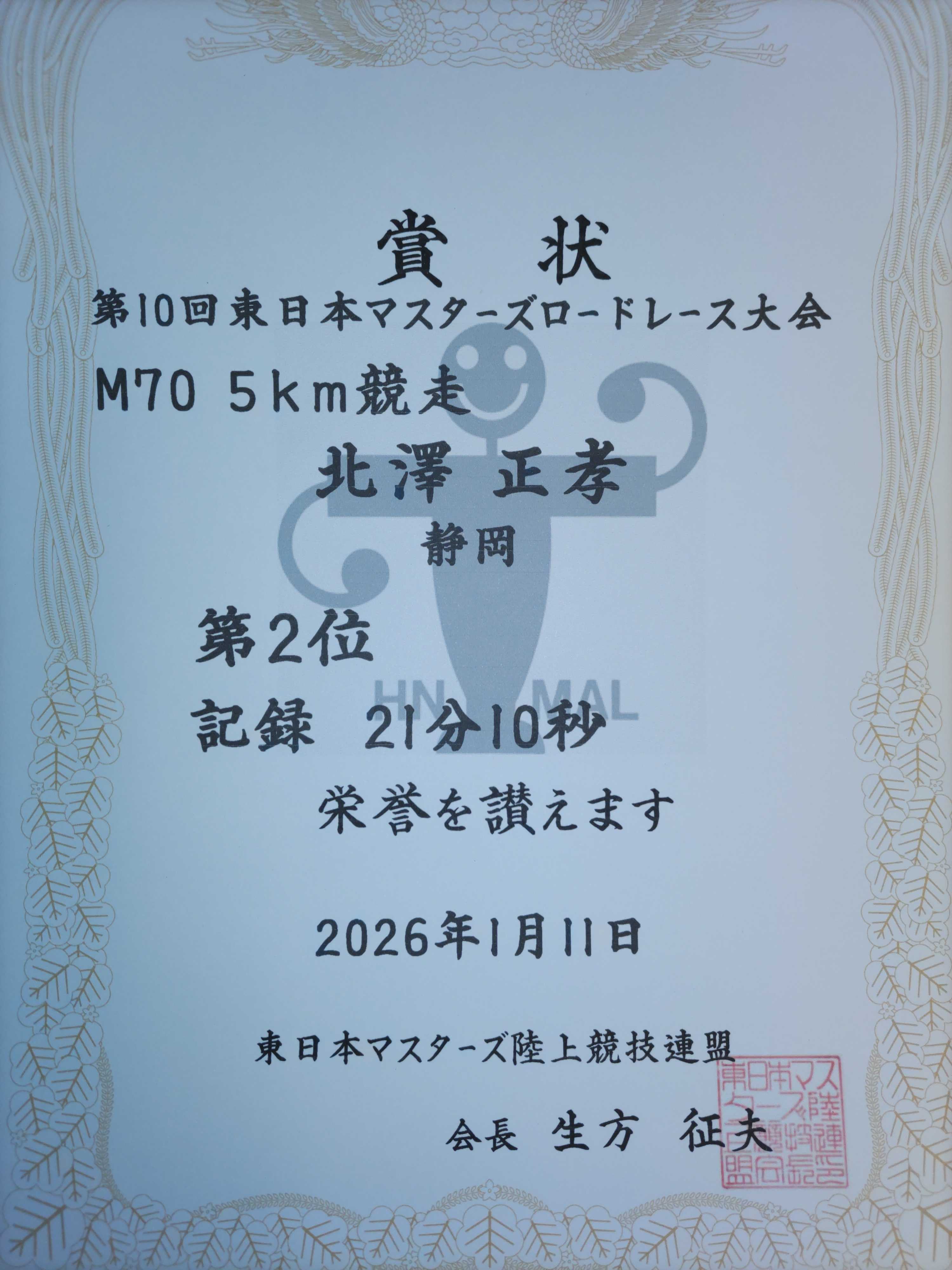 1月10日(土)の東日本マスターズロードレース出場のため 東京都に来ました。途中、日本百名城の八王子城 に登城しました。ホテルは東横イン東京八王子駅北口に宿泊 しました。 1月11日(日) ホテル朝食 6:30 東横イン東京八王子駅北口 8:40発 受付は10時からスタートは12時なので、朝食後 ホテルでゆっくりとしました 徒歩 八王子駅 8:49発 中央線快速 立川駅 9:01着 9:16発 青梅線 西立川駅 9:19着 徒歩 大会会場(昭和記念公園) 9:30着 マスターズの係員から入場券をもらい入場しました。 入場してから公園内を散策しながら会場の運動広場 に向かいました。 受付 10時 うんどう広場の本部で受付票を出して 参加賞、 ゼッケンを受領 10時30分ごろからアップを開始しました。 スタート時間 12時00分 スタートリストを見ると、東京都の野田さんが同じ M70の部にエントリ していました。とても勝てる相手ではないので、2位を目指して走りました。後半のアップダウンでタイムが 伸びず目標の20台は達成できませんでした。 5km M70の部(70歳~74歳) 2位 21分10秒 ラップ 1km 4分07秒 2km 4分13秒 3km 4分09秒 4km 4分17秒 5km 4分24秒 平均ペース 4分14秒 幻の大会記録になりました。 今までのM70(70歳~74歳) 大会記録 21分52秒 上記の記録を更新しましたが、1位の野田さんのタイムが新記録になるので、残念ながら幻の記録となりました。 ゼッケン ![]() 参加賞(手袋) ![]() 賞状 ![]() 大会会場(昭和記念公園) 13:20発 徒歩 西立川駅 13:30発 青梅線 立川駅 13:34発 中央線快速 現在、こだまの車中です。以下は予定です。 東京駅 14:13着 14:27発 東海道新幹線 こだま733号 切符は行きと同じ「ジパング俱楽部」で3割引きで購入 ![]() 掛川駅 16:06着 16:17発 東海道本線 豊田町 16:35着 徒歩 自宅 16:45着 次回の大会は2月1日(日)の東京ベイ浦安シティ マラソンの10Kmに出場します。 目標は43分台のタイムで上位入賞です。 この大会は浦安市民対象ですが、ふるさと納税 をすると参加する権利がもらえます。 お気に入りの記事を「いいね!」で応援しよう