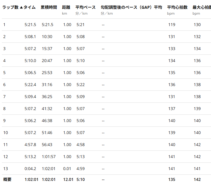 次に目指すレースは 2月1日(日) 千葉県 東京ベイ浦安シティマラソン 10Km です。 この大会は浦安市民限定ですが、「ふるさと納税」 を利用して大会参加権利を得ました。 大会まで約3週間、まずは故障のないように気をつけます。 目標は43分台のタイムで年代別で上位入賞です。 1月12日(月) 見附天神・かぶと塚コース 天候 晴 温度 1.0℃ 湿度 72% 風速 5m ジョッギング 12Km 5分12秒/Km 平均ビッチ 186spm 平均歩幅 104cm 平均心拍数 138pm VO2max 51 今日は今年最低の温度で風も強いので、あまり風の影響を受けないコースの 見附天神・かぶと塚コースを走りました。このコースで走るのは今年初めて です。いつもコースは後半のかぶと塚コースに行く上り坂とかぶと塚の走り にくい道でいつもペースが落ちてしまいます。今回も同じように6Km過ぎか ら8Kmにかけてタイムが落ちいています。しかし、今日は本当に汗もあまり かかず寒いランでした。 走行データ ![]() 1月13日(火) 竜洋コース 天候 晴 温度 3.5℃ 湿度 75% 風速 1m ジョッギング 12Km 5分00秒/Km 平均ビッチ 188spm 平均歩幅 107cm 平均心拍数 131pm VO2max 51 今日は気温は低いですが、ほとんど風もなく太陽の光もあたって寒さを感じる ことはありませんでした。本当にラン日和の日でした。走りもいつも通り後半 にペースアップできましたが、右の大殿筋に痛み・違和感がありました。 ハムストリングにかけてのツッパリ感はなかったので、結構走りやすかった です。この調子で練習が続けられればと思います。 走行データ ![]() 1月14日(水) 見附天神・かぶと塚コース 天候 晴 温度 5.5℃ 湿度 64% 風速 5m ジョッギング 12Km 5分08秒/Km 平均ビッチ 186spm 平均歩幅 105cm 平均心拍数 146pm VO2max 51 今日は朝から強風で風も冷たいので、風の影響が少ないコースに変更してラン しました。それでも後半になると少し向かい風になりバテバテの走りになりま した。また、後半から右足の大殿筋、股関節が痛みだし信号で止まった時に屈伸 運動をしました。屈伸運動をすると痛みは大分和らぎました。 走行データ ![]() 1月15日(木) 竜洋コース 天候 曇り 温度 4.3℃ 湿度 75% 風速 3m ジョッギング 12Km 4分53秒/Km 平均ビッチ 186spm 平均歩幅 110cm 平均心拍数 135pm VO2max 51 今日はあまり風が強くなかったので、いつもの竜洋コースでランしました。 そんなに調子は良くないのですが、今年一番の速いペースで走ることが できました。今月は5分/Kmを切るペースで走れたのが、今日を含めて 6回目です。ここ数年では一番よい走りができているようです。しかし、 身体は全然ダメです。今日も後半から右足の股関節まわりと大殿筋が痛み 出しました。いつになったら痛みがなく走れるのでしょうか。 走行データ ![]() 1月16日(金) 竜洋コース 天候 晴 温度 14.0℃ 湿度 59% 風速 5m ジョッギング 12Km 5分10秒/Km 平均ビッチ 186spm 平均歩幅 104cm 平均心拍数 135pm VO2max 51 今日はバセドウ病の3か月に一度の通院日なので、診察終了後に近くの佐鳴湖でラン しました。いつも結構ゆっくりペースですが、今日はなかなかいいペースで走ること ができました。しかし、後半になって右の大殿筋と腰に痛み・違和感が生じました。 屈伸運動をすると緩和されますが、暫くするとまた痛み出します。ここ2、3日は この状態が続いています。暫く様子を見ることにします。 走行データ ![]() 1月17日(土) 竜洋コース 天候 晴 温度 4.7℃ 湿度 77% 風速 2m ジョッギング 15Km 4分57秒/Km 平均ビッチ 188spm 平均歩幅 108cm 平均心拍数 132pm VO2max 51 今日は走る前から右足の大殿筋からハムストリングスにかけて違和感がありましたが、 何とか走りきることができました。15Km走は約半月ぶりでした。いつも通り後半に かけてペースアップでき5分/Kmを切るペースの走りは約2年ぶりのペースでした。 ここのところ実感として走力が戻ってきている感じがします。しかし、今日も右足の 調子は今一です。5Km過ぎから違和感が痛みに変わり、信号で止まっているときに 屈伸運動をして何とか最後まで持ちこたえることができました。 走行データ ![]() 1月18日(日) 竜洋コース 天候 晴 温度 6.8℃ 湿度 70% 風速 2m ジョッギング 20Km 5分06秒/Km 平均ビッチ 187spm 平均歩幅 105cm 平均心拍数 131pm VO2max 51 約1か月ぶりの20Km走でした。いつもどおり後半に多少のペースアップ ができましたが、最後の方はバテバテの走りでした。右足の調子は15Km くらいまでは、違和感・痛みもなかったのですが、その後はハムストリング に痛みが出できました。しかし、昨日よりは大分ましになったようです。 もう少し様子を見てみようと思います。 走行データ ![]() お気に入りの記事を「いいね!」で応援しよう