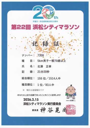自宅発 6:15 徒歩 豊田町駅 6:31発 JR東海道本線 浜松駅 6:39着 徒歩 新浜松駅 6:48発 遠州鉄道(赤電) 上島駅 6:58着 徒歩 四ツ池公園陸上競技場 7:15着 陸上競技場の観覧席に荷物を置いて、7時30分過ぎにアップを開始しました。いつもどおり動的ストレッチをした後、2Kmくらい軽くじょっぐをしてから最後に100M×3のWSをしてアップを終了しました。スタート時間は9時00分でした。コースは2Km手前から約200mのゆるい上り坂(帰りは下り)がありますが、後は平坦で走りやすいコースです。1Kmあたりから大腿直筋と思われる箇所にズキンとした痛みがでてきました。この箇所の痛みは初めてです。一瞬DNSが頭をよぎりましたが、まずはいけるところまで頑張ろうと思いました。ラストまで痛みはとれませんでしたが、何とか最後まで走ることができました。目標は20分台でしが、またしても突破することができませんでした。しかし、このコースはみんな少し距離が長いと言っています。自分の時計では約100mくらい長いです。自分の時計を信じれば何とか20分台で走ることができみたいです。静岡県の大会なので他県の参加者には負けずに頑張ろうと思い走り年代別で優勝することができました。しかし、大腿直筋と思われる箇所は今も歩くと痛みがあります。 一過性であることを祈るしかありません。 5km 70歳の部 優勝 21分20秒 ラップ 1km 4分01秒 2km 4分20秒 3km 4分11秒 4km 4分10秒 5km 4分08秒 少し距離が長い分 28秒 平均ペース 4分10秒 ゼッケン・プログラム ![]() 完走証 ![]() 参加賞 (Tシャツ、ドリンクなど) ![]() ![]() 賞状 ![]() 入賞メダル ![]() 入賞賞品(リンゴ1箱、うなぎサブレ、スポーツタオル) ![]() ![]() 四ツ池公園陸上競技場 10:30発 徒歩 上島駅 10:46発 遠州鉄道(赤電) 新浜松駅 10:56着 徒歩 浜松駅 11:08発 豊田町駅 11:16着 徒歩 自宅着 11:30 次回の大会は3月1日(日)の藤枝マラソンの 10Kmに出場します。 目標は42分台のタイムで上位入賞です。 お気に入りの記事を「いいね!」で応援しよう