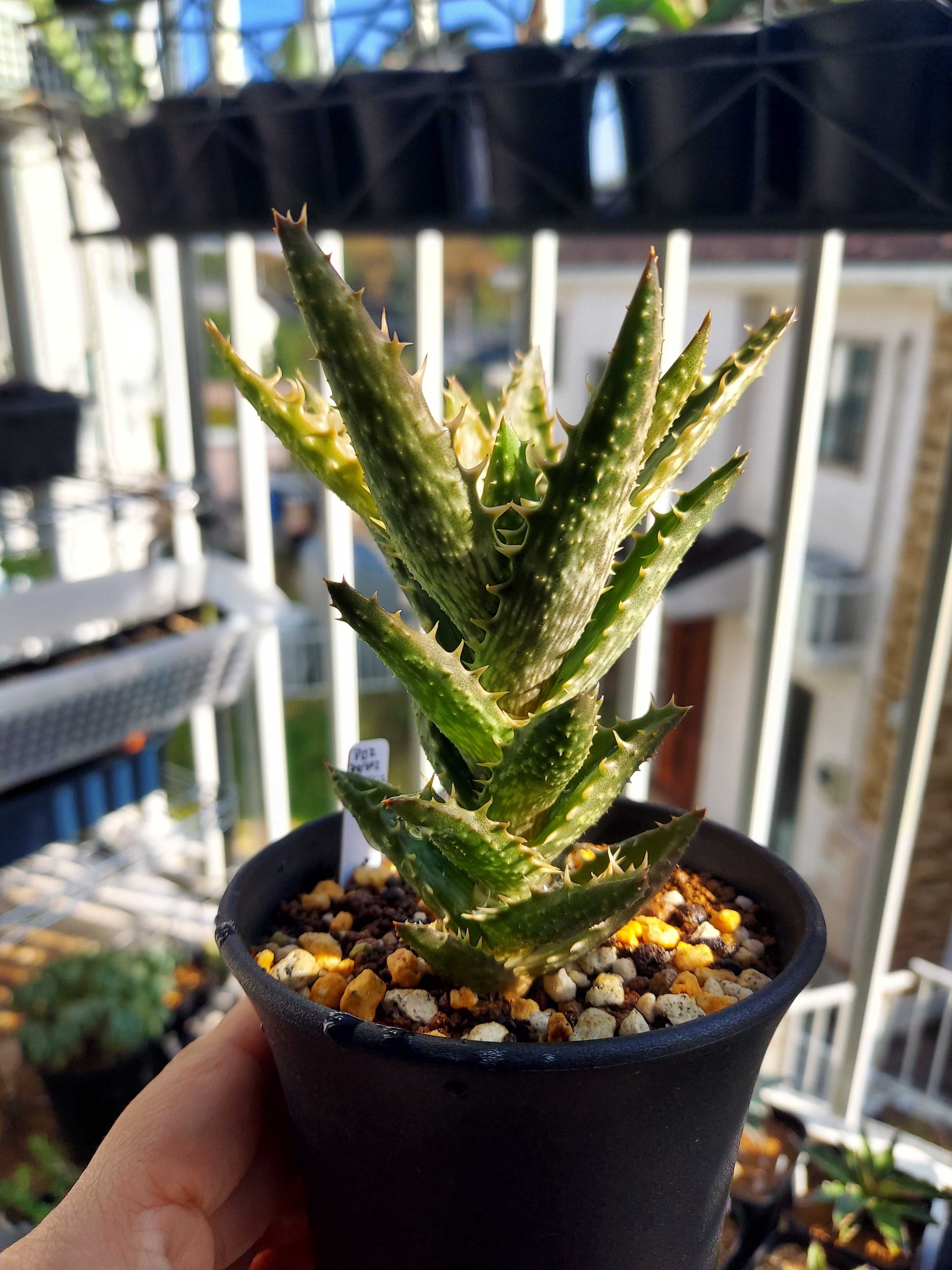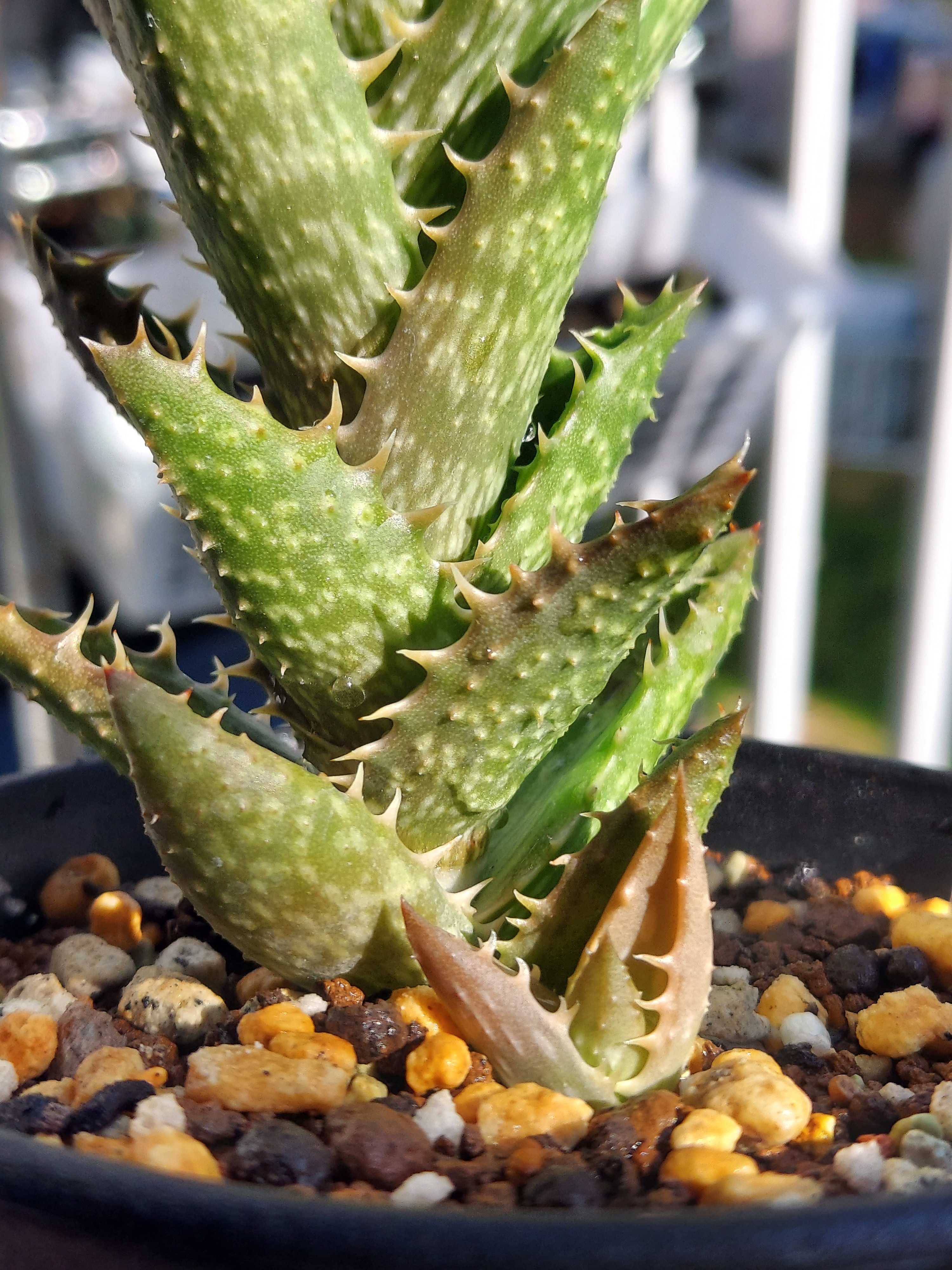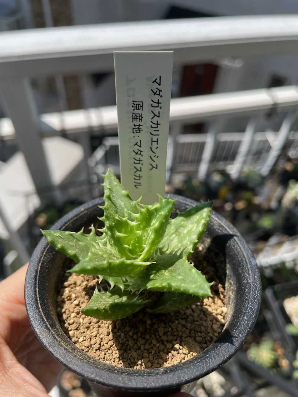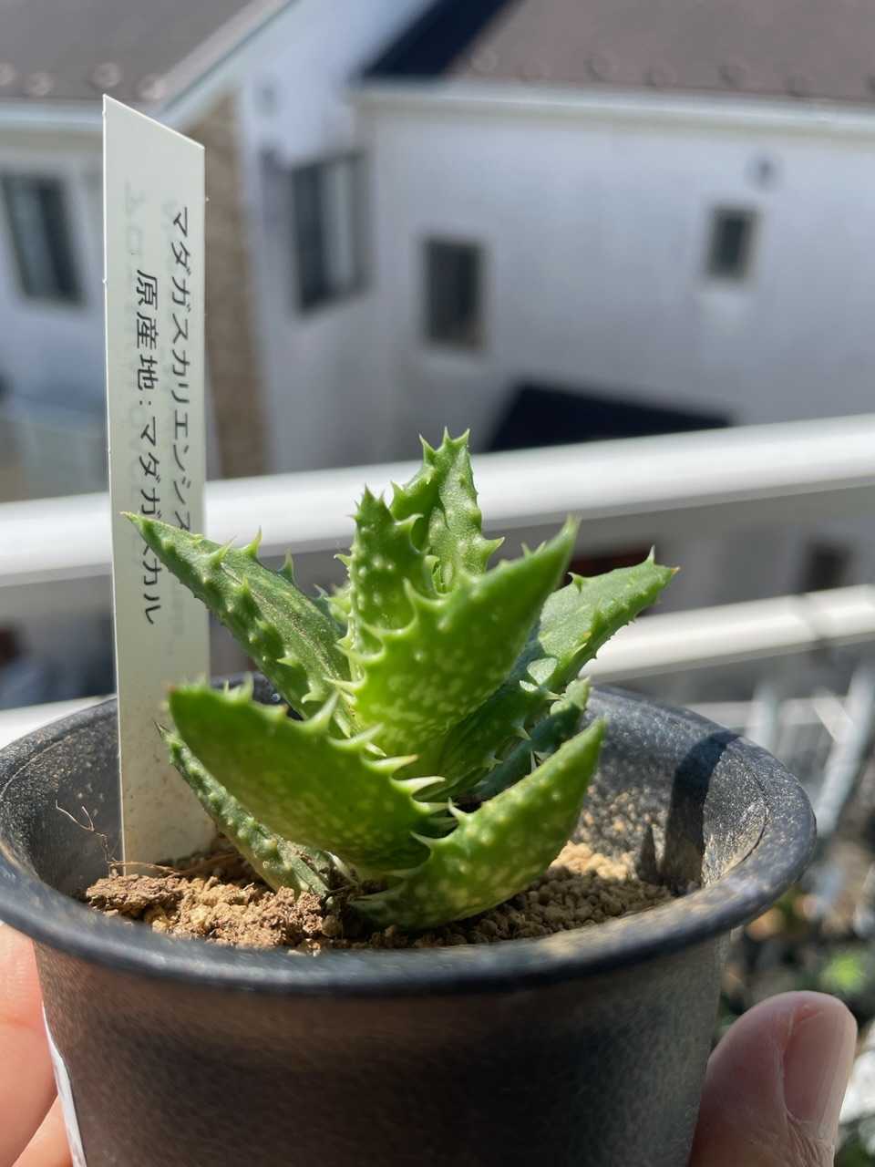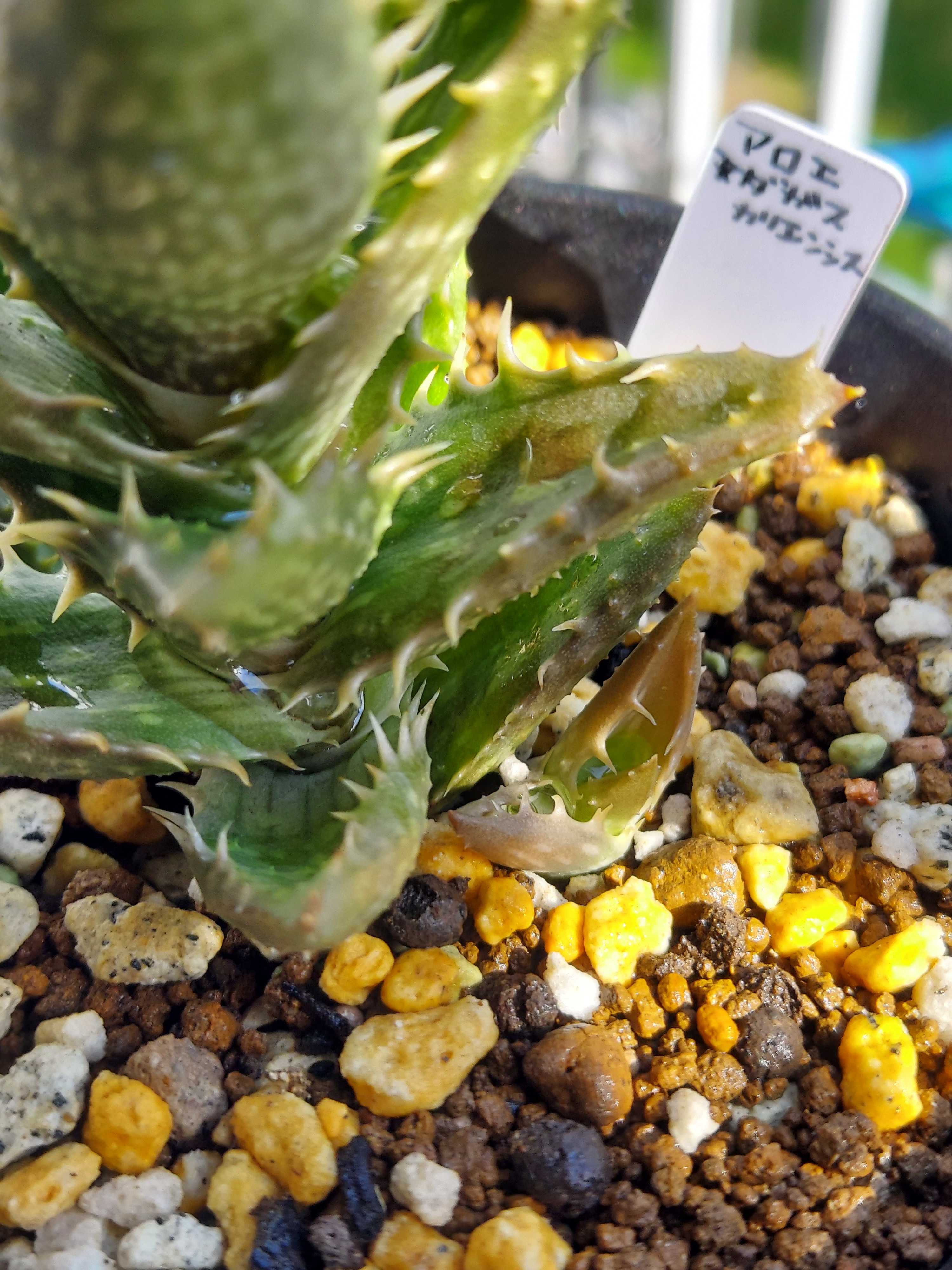 我が家のアロエは4つ…いや5つか。ハオルチオイデスが何者なのかいつもわからなくなるのだが、あれもアロエだな、だから5つ。 そのうちのひとつ、マダガスカリエンシスに子株ができていた。 わあ〜かわいい〜。ガンガン日なたにいるせいか、赤いね。少し日当たりわるいところのほうがいいのかなあ。でもまあアロエは色が変わりやすいので、いいか。(適当) 買ってきたのは今年の6月、近所のホームセンターから。 「ちょっぴりレアな多肉植物」みたいなシリーズがたまに出ていて、そこにいた。 2.5号鉢にちょこん、なので小さいが、葉っぱの爬虫類っぽさがとても好みで即決。 その後3号鉢に植え替えもして、購入から約5ヶ月、夏を越えて大きくなった。 植え替え時に元肥としてマグァンプは入れるが、それだけでこんなに葉っぱ大きくなるのか〜という感じ。すごいなあ。 葉色のくすみは日焼けだとおもうが、よく日にあてたいので遮光はしない。 下葉が枯れないタイプ。このまま縦にぐんぐん伸びるのだろうか。 子株の様子はどうだろう。 水やりをしたあとで中に水が貯まっているが、葉っぱも薄くて、まだ出来たてホヤホヤ感がある。 ウーン、かわいい。このアロエは持っている中で一番の新顔なので、まさかこんなに早く子をつけてくれるとは思わなかった。寒くなってきたのであまり成長しないかもしれないが、冬本番までにちょっとでも大きくなっておいてほしいなあ。