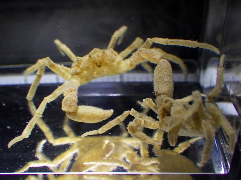 大阪市立自然史博物館で開催されている、特別展「石は地球のワンダー」鉱物と化石に魅せられた2人のコレクションを見に行ってきました。2人のコレクションとは、北川隆司教授の鉱物コレクション、金澤芳廣氏の化石コレクションであり、同時に47都道府県の石が展示されてありました。鉱物コレクションの展示で目を引くのは、色彩や形状、そして模様だと思います。実際「きれい~!」という声が飛び交っていました。色彩的に目立った鉱物の一部がこちらです。ミメット鉱(Mimetite)。藍銅鉱(Azurite)。岩塩(Halite)。紅鉛鉱(Crocoite)。オパール(蛋白石)(Opal)。そして形状や模様が興味深いと感じた鉱物の一部がこちらです。赤鉄鉱・石英(水晶)(Hematite, Quartz)。黄鉄鉱(Pyrite)。銀星石(Wavellite)。球状閃緑岩(ナポレオン岩)(Orbicular diorite)。石英(水入り瑪瑙)(Quartz(Agate))。そして砂漠の薔薇。重晶石(砂漠の薔薇)(Barite)。石膏(砂漠の薔薇)(Gypsum)。特別展タイトルの地球のワンダーの意味がすごくわかった気がしました。人工的に作られたのではないかと思うほど見事な形状、そしてカラフルな色彩など、不思議な石がたくさんあるのだと只々驚嘆しました。そしてこのとき私はすでに鉱物の美しさに魅了されていたのです。化石コレクションでは、和泉層群から発見された白亜紀後期の化石が展示されてありました。こちらはノジュールの展示です。下は割ったところ。化石を見つけるにはまずノジュールを見つけることと何かの本で読んだ記憶があります。隣にはアンモナイトの化石が展示されてありました。アンモナイトの化石は大きなものばかりでした。香川県から見つかった恐竜化石(椎体)の展示もありました。ハドロサウルス類の化石である可能性が高いと考えられているようです。エンコダスの頭骨の一部の化石。ほかの脊椎動物の化石の一部がこちら。モササウルス類の顎の一部の化石。ラブカ類の歯の化石(上)とカグラザメ類の歯の化石(下)。再びアンモナイト(異常巻き)の化石が展示されてありました。ほかマツ科の植物の化石(上)やリヌパルス(エビ)の化石(下)。化石展示はアンモナイトにしろ、木の化石にしろ、大きなものが多く、さらに香川県初となる恐竜化石を含め、インパクトがある内容でした。化石探しをしたことはほとんどないけれど、なぜか高まる興味~。ノジュールって慣れてくるとわかるようになるんでしょうか。47都道府県の石の展示ではどこかで見たことがあるような馴染み深い石や変わった石、美しい石などがたくさんありました。個人的なピックアップがこちらです。宮崎県の鬼の洗濯岩(砂岩泥岩互層)。京都府の桜石。山梨県の日本式双晶水晶。ちなみに大阪府の石として展示されていたのはドーソン石でした。聞きなれない石ですが、大阪南部の和泉層群には多いようです。今回の特別展ですっかり石に魅了された私です。北川隆司教授の本「教授を魅了した大地の結晶」を思わず購入してしまいました。おわり。