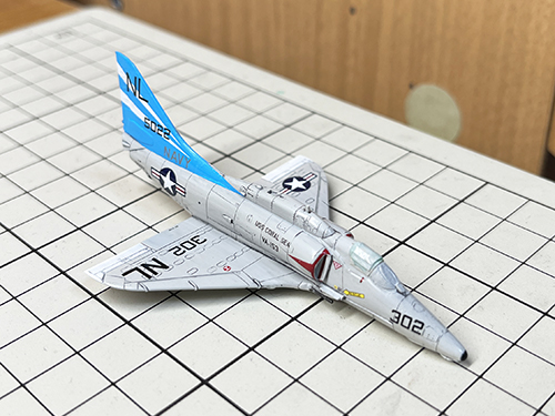 PLATZ A-4スカイホーク TOPGUN 制作その5 です。 今回はデカール貼り。 まずはブルー迷彩から。 反対側は~ 下面は~ デカールは レディジェシー のものと比べると台紙が小さく印刷されたものが詰まった感じだったので切難かったです。 それと レディジェシー に付いていた主脚収納庫内のデカールは付属しておりませんでした。 フラップのデカール同様にサービスデカールだった様です。 続いてブルーテイルです。 反対側は~ 下面は~ こちらは エリア88グレッグ機 で使用してしまったものが有る為(エアインテイク部等)残り物で代用と、足りないものは トップガン で使わないものを使用。 エアインテイク部内側の赤い縦ラインですが レディジェシー の時は指定図に番号と線が記されていたのですが今一不明だったのでオミットしてしまいました。